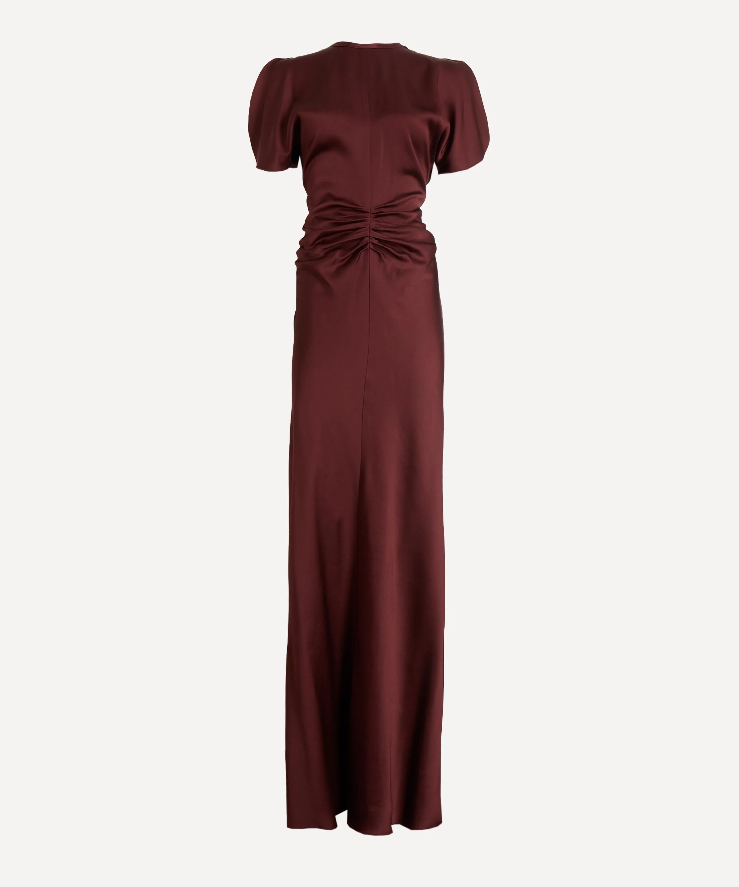 DETAILS Gathered midi dress Fitted waist Pleat and gathered detail on the front Short tulip sleeves Round neckline Back v-neckline Invisible zip with hook-and-eye closure SIZE & FIT Model is 180cm/5'11"; Chest: 79cm; Waist: 62cm; Hip: 89cm and wears a size S COMPOSITION & CARE 100% Polyester Dry clean