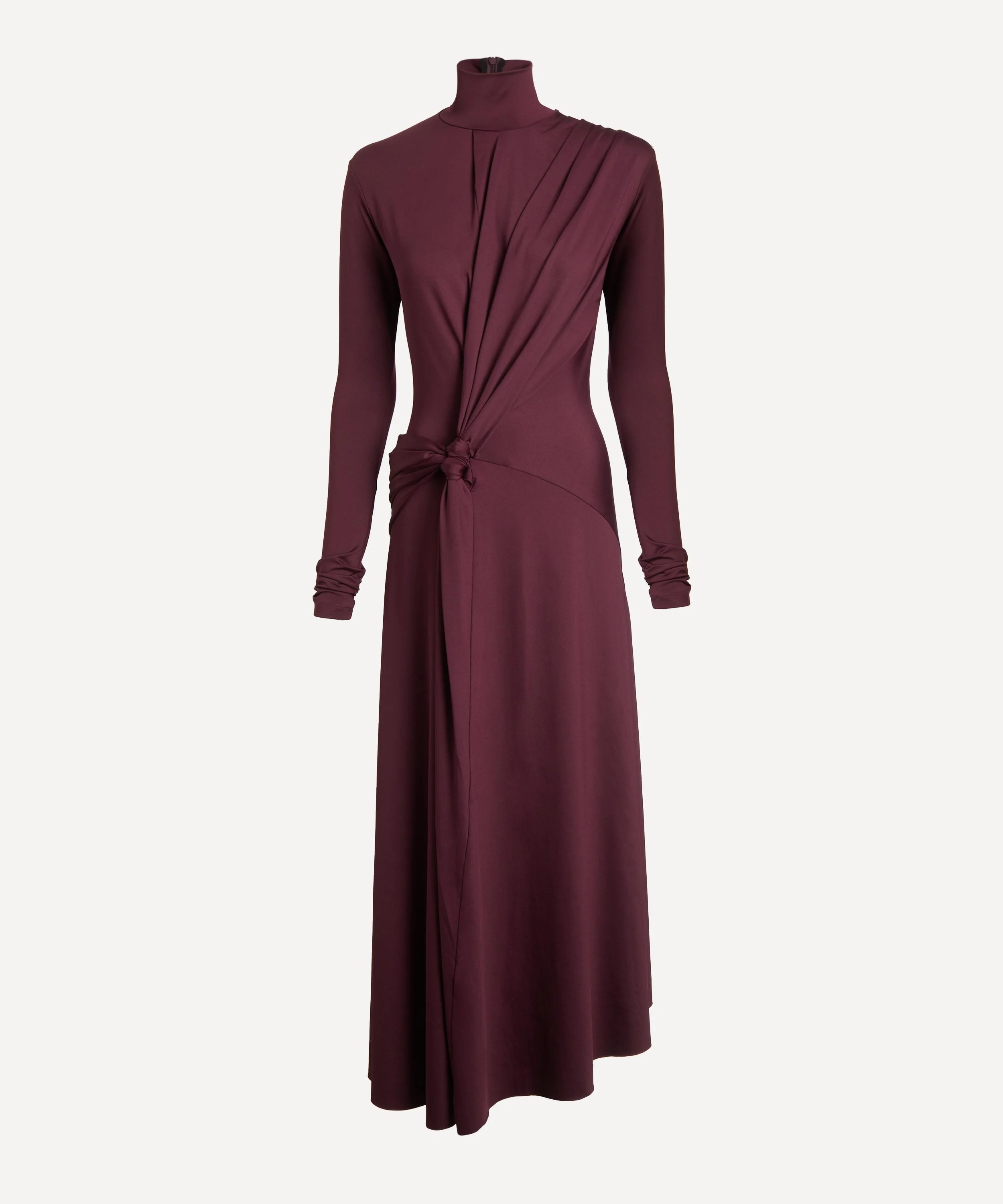 DETAILS Midi dress Stretch jersey Fitted bodice Long sleeves High-neck Twisted front panel Asymmetric hem SIZE & FIT Model is 178cm/5'10"; Chest: 77cm; Waist: 65cm; Hip: 92cm and wears a size 8 COMPOSITION & CARE 90% Polyester; 10% Spandex Dry clean