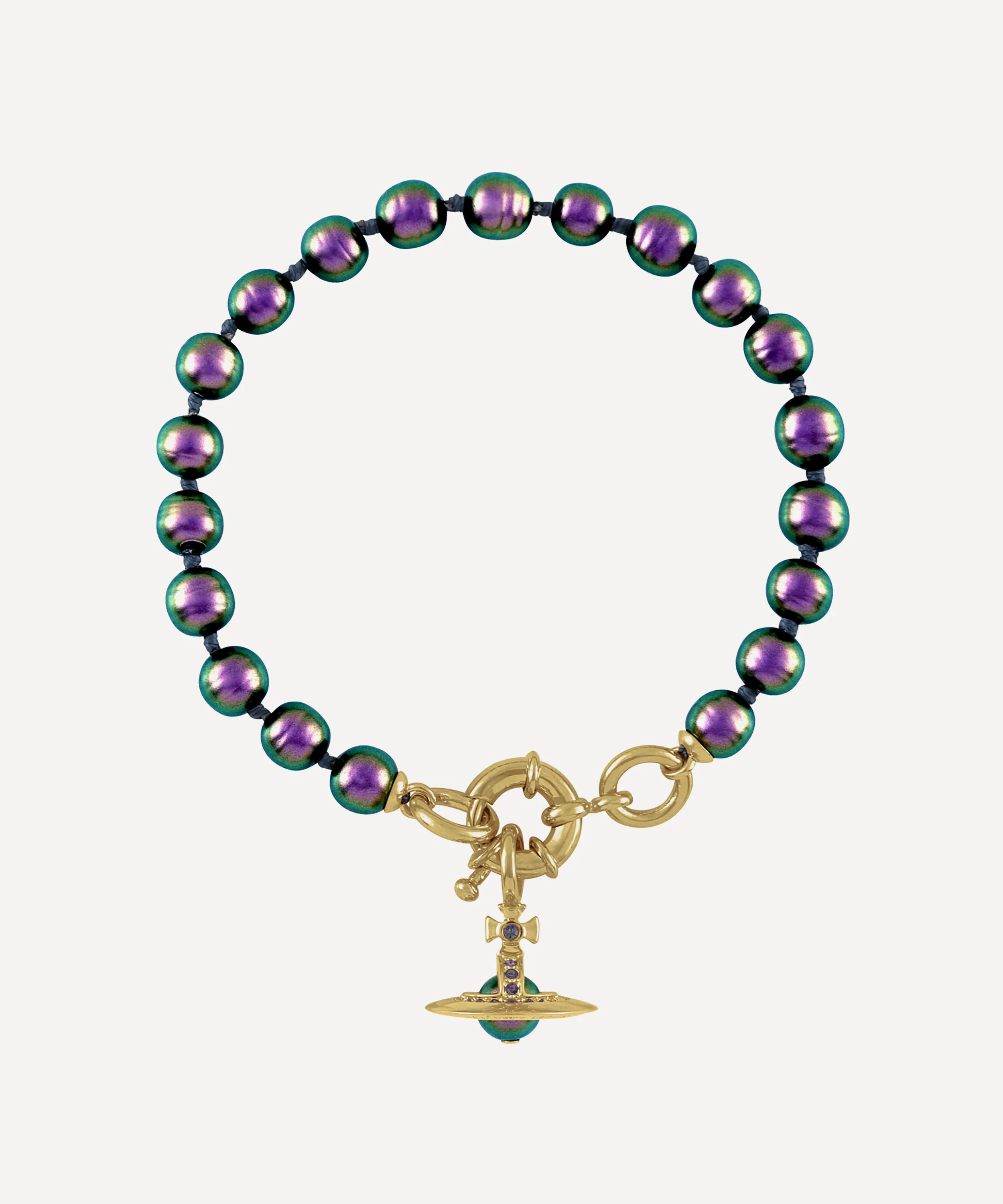 DETAILS Bracelet Gold-tone brass Three-dimensional orb and Saturn ring pendant Purple, glass-based pearls Crystal accents Polished finish Spring clasp fastening COMPOSITION & SIZE Gold-Tone Brass; Crystal; Glass Pearl L: 17.5cm