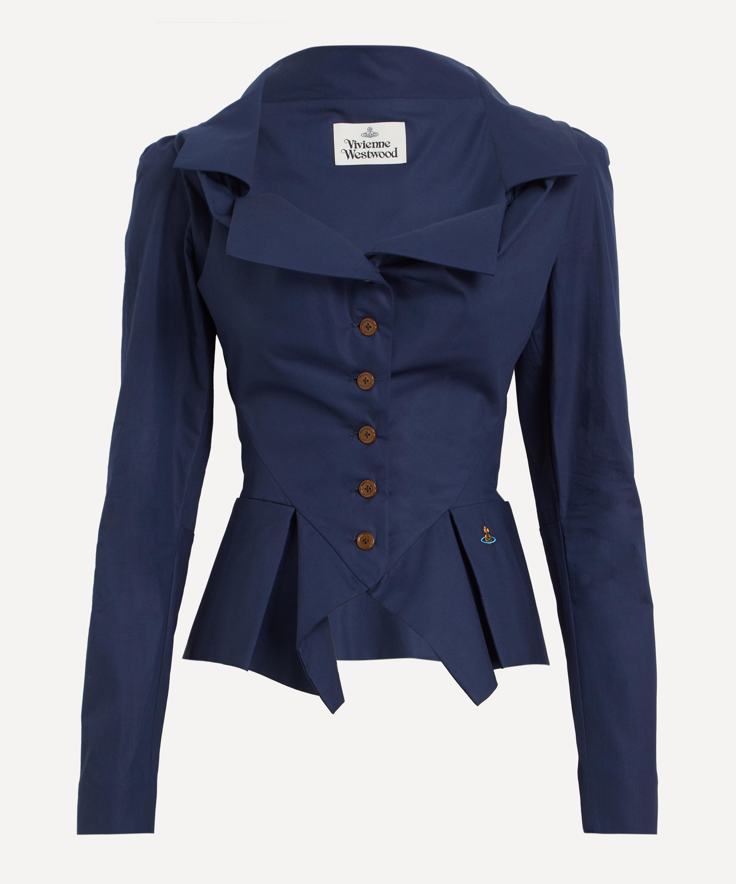 DETAILS Cotton shirt Fits true to size Longline silhouette Puffed shoulders Long sleeves Origami-style open neckline Fitted waist with darting detail Flared peplum hem Front button placket Orb embroidery SIZE & FIT Model is 180cm/5'11"; Chest: 79cm; Waist: 62cm; Hip: 89cm and wears a size 8 COMPOSITION & CARE 100% Cotton Dry clean