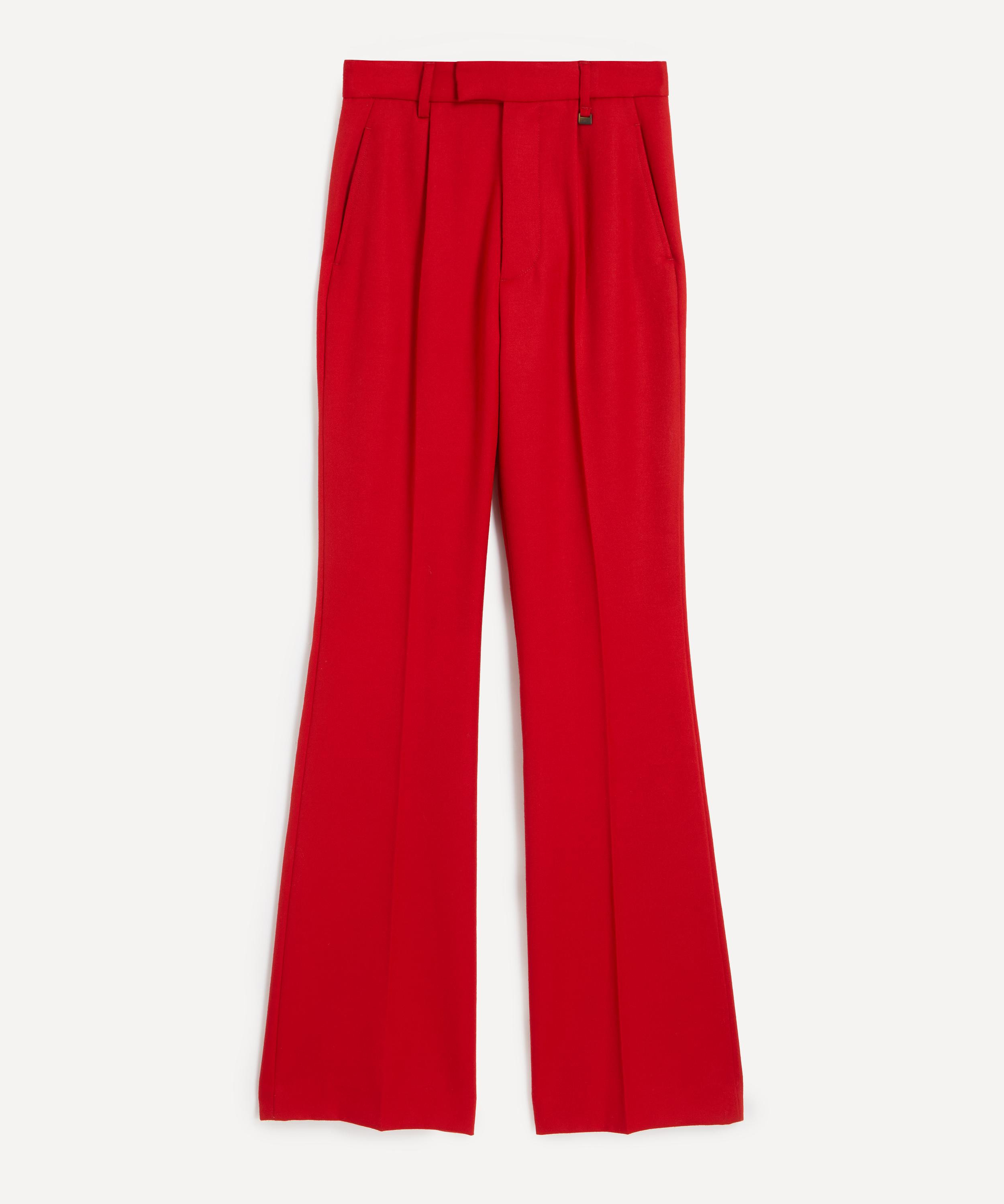 DETAILS Red wool trousers High-waisted fit Flared leg Pressed centre creases Belt loops Concealed front fastening Side pockets Rear welt pocket Made in Italy SIZE & FIT Model is 178cm/ 5'10"; Chest: 81cm; Waist: 58cm; Hip: 91cm and wears a size 8 COMPOSITION & CARE 100% Wool Dry clean