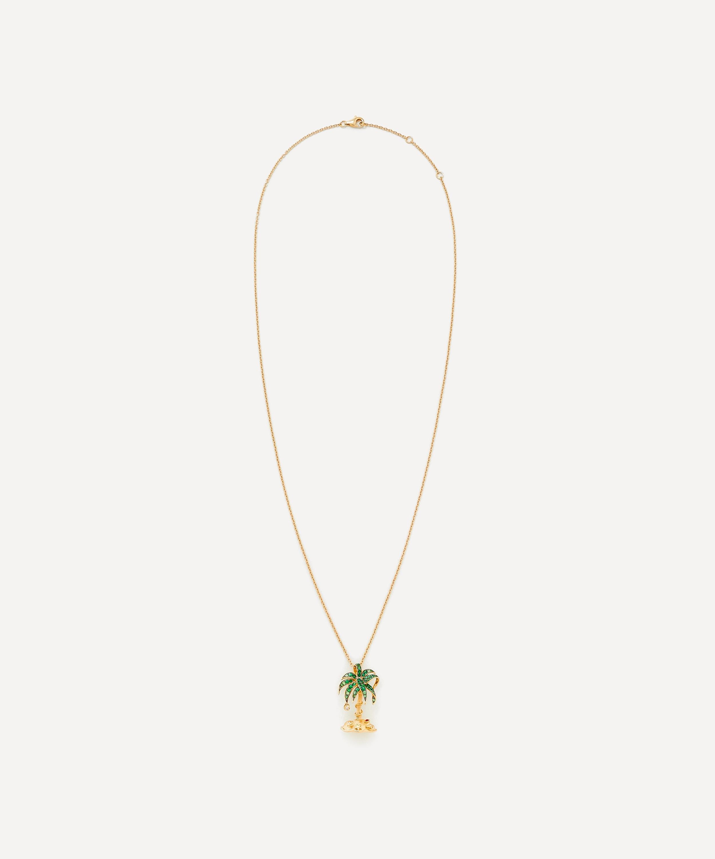 DETAILS Pendant necklace 18ct gold Palm tree pendant Green tsavorite set leaves Black enamel Floating brown diamond accent Ruby accent Trace chain Lobster clasp fastening COMPOSITION & SIZE 18ct Gold; Estimated 0.46ct Tsavorite; Estimated 0.2ct Rubies; Estimated 0.01ct Brown Diamond; Estimated 0.01ct Enamel Chain L: 55cm (approx)
