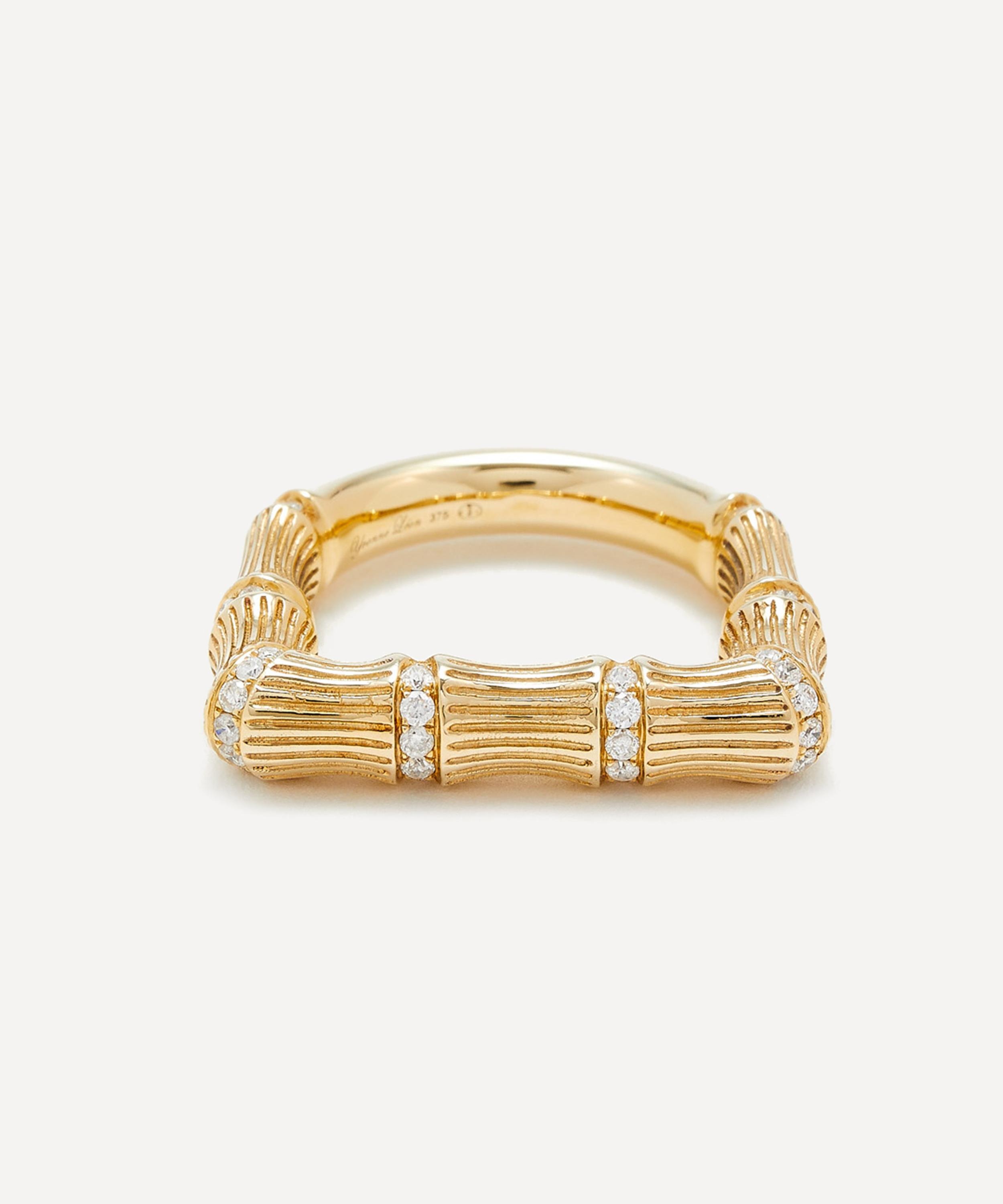DETAILS Ring 9ct gold Ridged bamboo-inspired design Grey diamonds Squared silhouette COMPOSITION & SIZE 9ct Gold; Estimated 0.30ct Grey Diamond