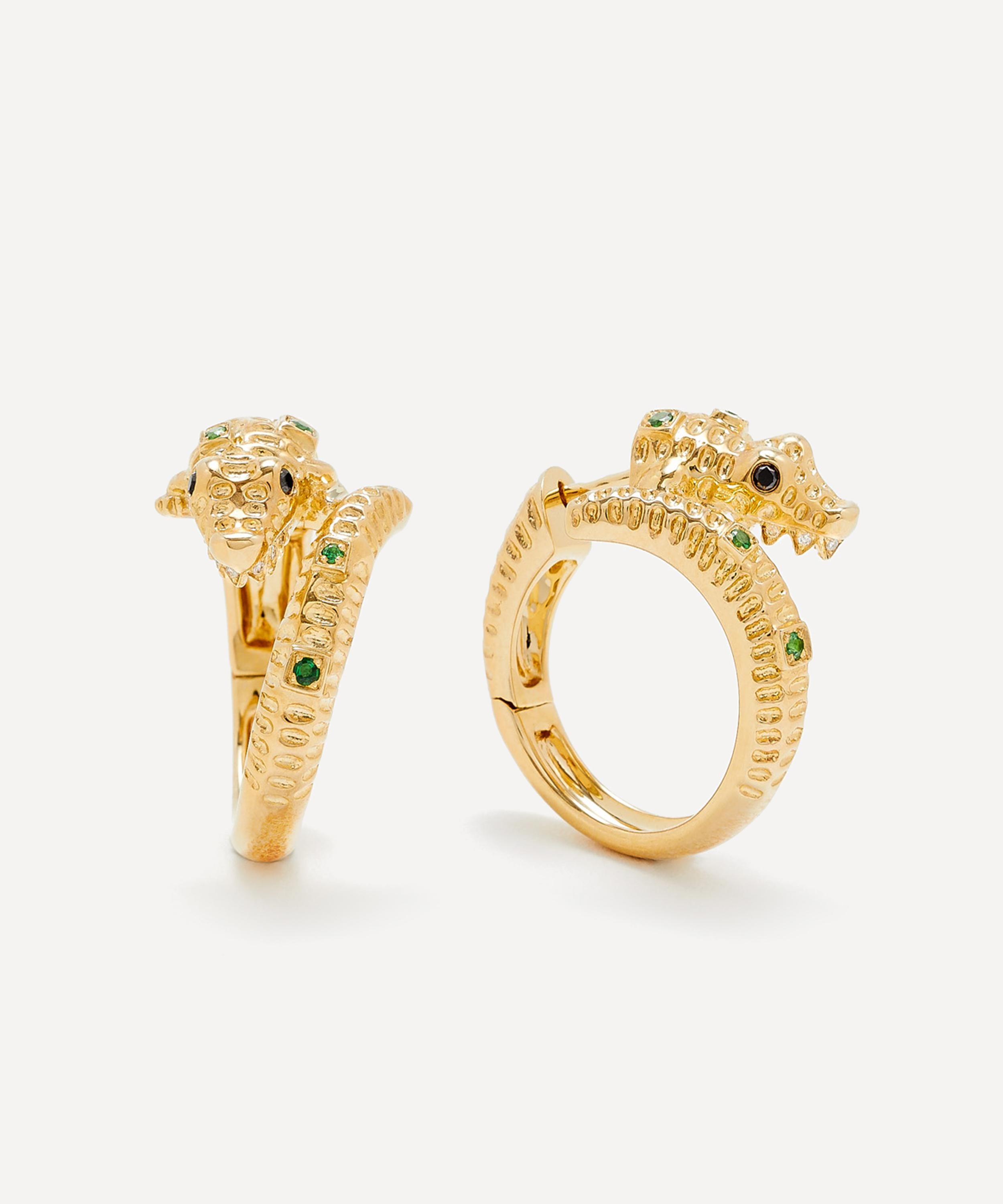 DETAILS Hoop earrings 9ct gold Crocodile design Green tsavorite set scales Black diamond set eyes Grey diamond set teeth Polished finish Hinge clasp fastening COMPOSITION & SIZE 9ct Gold; Estimated 0.08ct Tsavorite; Estimated 0.06ct Black Diamond; Estimated 0.02ct Grey Diamond Internal Dia: 1.6cm