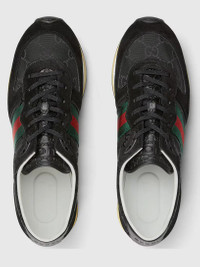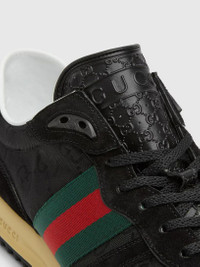Library New York is a collection of high-end and hype items for sale at the best price possible. We have been in business since 2011, and 100% authenticity is always guaranteed. In the Fall Winter 2025 collection, the Gucci Re-Motion sneaker blends classic with contemporary elements. Crafted from GG canvas, the model is completed with the signature green and red Web. The lightweight, flexible outsole has gone through a special treatment to create a retro appeal. Black Original GG canvas Suede trim GG nylon Green and red Web stripe Rubber sole with Interlocking GG logo and Gucci lettering Interlocking GG details on the eyelets Tongue with 3D Gucci logo and Interlocking GG, created with a high-frequency embossing technique Lace-up closure Height: 25 mm Made in Italy