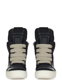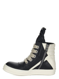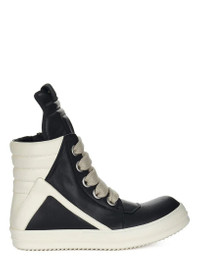 THESE JUMBOLACE GEOBASKETS ARE ABOVE-ANKLE HEIGHT. THEY FEATURE AN EXTENDED TONGUE WITH WEBBING TAB, SIGNATURE GEOMETRIC PANELS AND A PADDED BACK COUNTER WITH LINES OF TOPSTITCHING. THEY HAVE JUMBO LACES, A ZIPPER ON THE INSIDE ANKLE FOR EASY FASTENING AND SHARK-TOOTHED BUMPER SOLES. THIS MEDIUMWEIGHT FULL GRAIN COW LEATHER HAS A FLAT AND MATTE SURFACE FINISH AND IS SPECIFICALLY TANNED FOR SHOES WITH AN ABRASION-RESISTANT FINISH. THIS TANNERY IS LWG CERTIFIED WITH A BRONZE RATING. COLOR: BLACK/MILK/MILK MATERIAL: UPPER 100% COW LEATHER LINING 100% CALF LEATHER INSOLE 100% CALF LEATHER SOLE 100% THERMOPLASTIC RUBBER SOLE HEIGHT 3.5CM