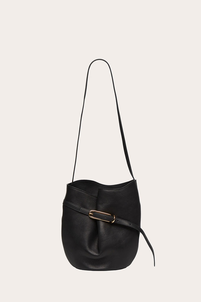 The silhouette of the Belted Bucket Bag echoes seashells, driftwood and other organic shapes found in nature, adding an artful finish to every look. It can be worn on the shoulder or crossbody and is cinched with a slender diagonal buckle that creates soft feminine curves when fastened. In a medium size, it’s equally chic on weekdays and weekends. Crafted from vintage effect leather that's been treated for a well-loved, worn-in look. - Hardware with gold finish - Internal zip pocket - Black - Certified Calf Leather by - LWG - Made in Italy DIMENSIONS H: 26 x W: 16 x D: 10 cm H: 10,2 x W: 6,3 x D: 4 in Strap drop: 42 - 49 cm / 16,5 - 19,30 in (Adjustable)