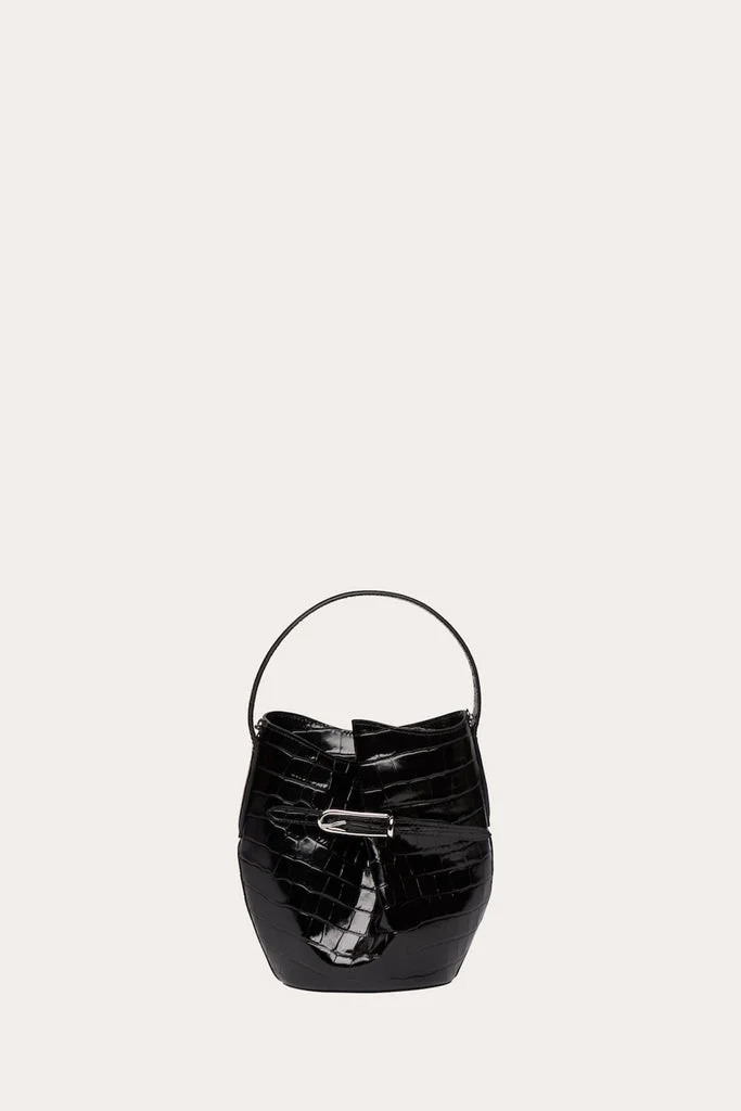 The mini version of the Belted Bucket Bag features a soft silhouette artfully fastened with a diagonal buckle and finished with a slender top handle. Just big enough for your sunglasses, lip gloss and wallet, it will add a bohemian vibe to day or evening outings. - Hardware with silver finish - Internal zip pocket - Black croc-embossed leather - Certified Calf Leather by - LWG - Made in Italy DIMENSIONS H: 22.5 x W: 21 x D: 13 cm H: 8.9 x W: 8.3 x D: 5.1 in Handle drop: 11.5 cm / 4.5 in