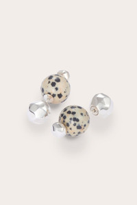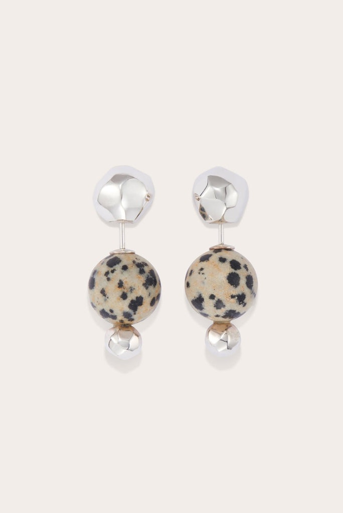 Our jewelry is a curated collection of subtle statement pieces created in our signature spirit of playful minimalism. The Dalmatian Barbells are the chic, elevated day to night luxury offering a playful twist to any look. - Recycled 925 Sterling silver - Natural Dalmatian Jasper stone - Made in Thailand DIMENSIONS Front sphere diameter: 10mm Stone diameter: 12 mm Back sphere diameter: 6mm Total length when closed: 31mm