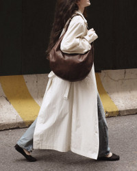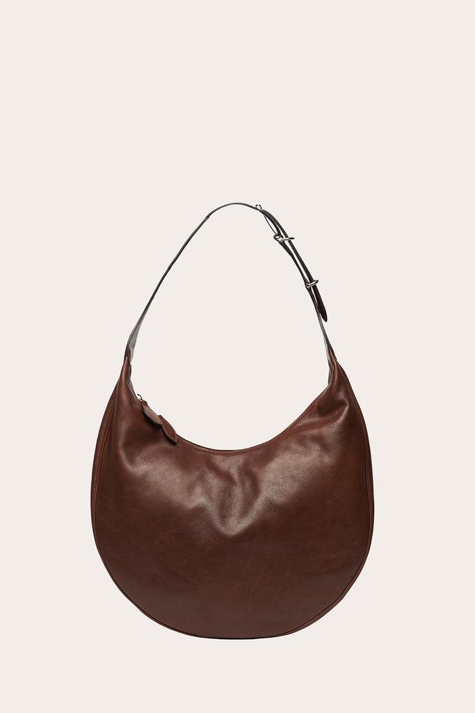 Deceptively spacious - it fits a laptop - our Moon Hobo is the new take on a work week essential. Its crescent silhouette comes in suede or new vintage effect leather that's been treated for a well-loved effect. A zipper keeps all items secure and a slender buckle on the handle adds a touch of glamour. Carry it on the shoulder or cross body. - Hardware with silver finish - Internal zip pocket - Smooth dark brown leather - Certified Calf Leather by - LWG - Made in Italy DIMENSIONS H: 27,5 x W: 40 x D: 9 cm H: 10,6 x W: 15,7 x D: 3,5 in Handle drop: 37 - 42 cm / 14,5 - 16,5 in (Adjustable)