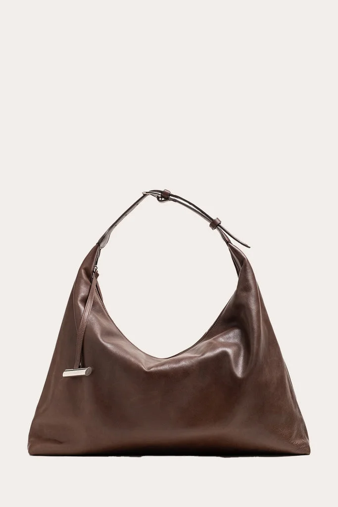 The Pillow Hobo is our new oversized soft and slouchy shoulder bag for your everyday needs. This latest addition to the Pillow family features an adjustable buckle for comfortable wear and is adorned with statement penne hardware. Roomy enough to fit a 13" laptop. - Hardware with silver finish - Internal zip pocket - Dark brown leather - Certified Calf Leather by - LWG - Made in Italy DIMENSIONS H: 37 x W: 44 x D: 8 cm H: 14,6 x W: 17,3 x D: 3,1 in Handle drop: 26 cm / 10,2 in