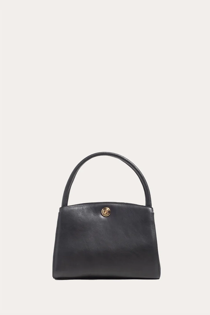 Named for the gleaming mandala-shaped push lock that keeps your belongings secure, this polished shoulder bag excels on busy days that start with meetings and end with martinis. Our vintage-effect leather has a timeless, worn-in look from the start and will continue to age beautifully over time. - Metal pushlock closure - Hardware with gold finish - Black vintage effect leather - Top handle - Certified Calf Leather by - LWG - Made in Italy DIMENSIONS H: 19 x W: 28 x D: 9,5 cm H: 7,4 x W: 11 x D: 3,7 in Handle drop: 14 cm / 5,5 in