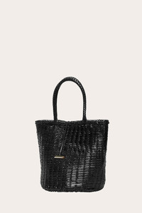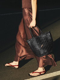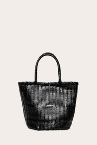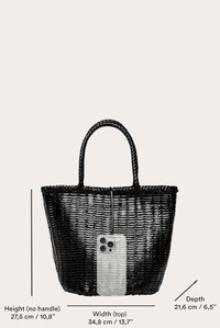 With its summertime allure, the Round Basket bag will accompany you and your essentials on endless errands. Handwoven from soft, naturally dyed leather and decorated with signature penne hardware, it’s the timeless piece that goes with everything. This is an artisanal product made of vegetable tanned, naturally dyed leather. Each basket is entirely crafted by hand and no two pieces are alike. If you find any curves in the weaving or shifting in the tone of color, they are signs of the artisanal nature of the production and not a manufacturing flaw. - Hardware with gold finish - Black - Sustainable vegetable-tanned woven calf leather - Made by hand In India DIMENSIONS H: 27,5 x W: 34,8 (top) x D: 21,6 cm H: 10,8 x W: 13,7 x D: 6,5 in Handle drop: 15 cm / 5,9 in