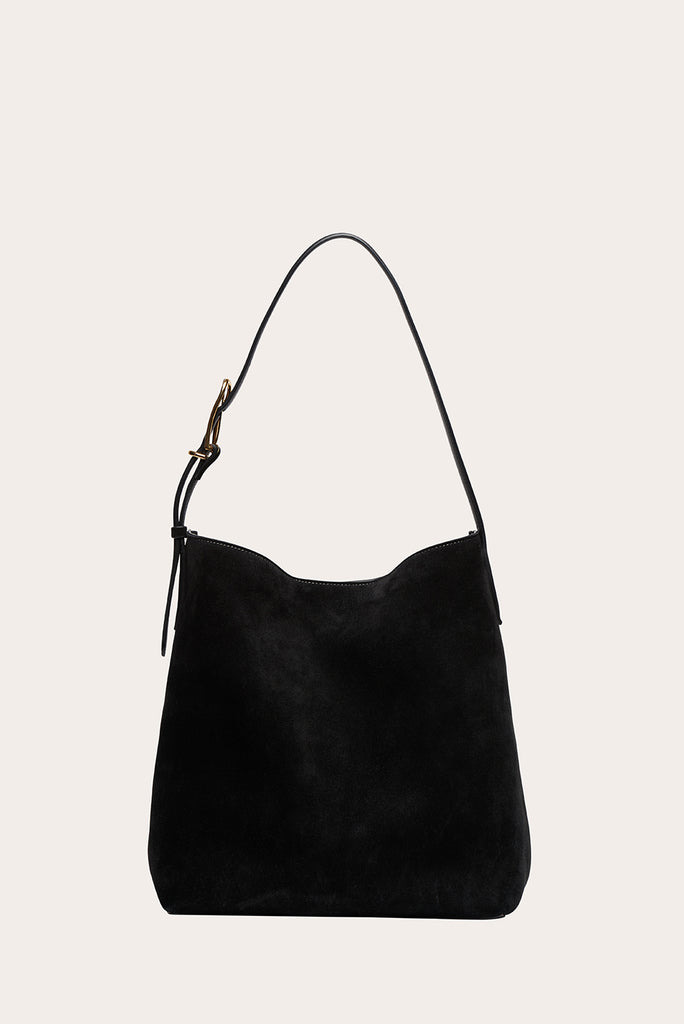 Unlined suede makes The Slouch Bucket Bag effortlessly lightweight, accentuating its boho-inspired silhouette and sculptural folds. Designed to fit a 13” laptop, a notebook or a tablet, the bag is finished with contrast white stitching and a longer strap. - Hardware with gold finish - No lining - Internal pocket - Black - Certified Silver Rated Suede by - LWG - Made in Italy DIMENSIONS H: 33 x W: 43 x D: 19 cm H: 13 x W: 16,9 x D: 7,5 in Handle drop: 30 cm / 11,8 in