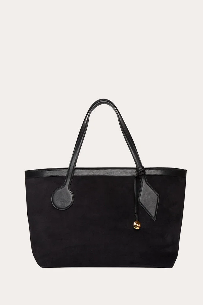 This updated take on the popular Sprout Tote is crafted from vintage-effect leather that's been treated for a well-loved, worn-in look. Fitted with longer asymmetrical sprout handles for comfortable shoulder carry, it is the ideal choice for work or weekend travel. A new removable golden charm adds a touch of gleam to the streamlined design. - Snap button closure - Internal zip pocket - Removable gold bag charm - Black suede leather - Black leather detail on top - Certified Silver Rated Suede by - LWG - Made in Italy DIMENSIONS Fits a 13-15" laptop H: 28 x W: 36 x D: 20 cm H: 11 x W: 14,1 x D: 7,8 in Handle drop: 21 cm / 8,2 in