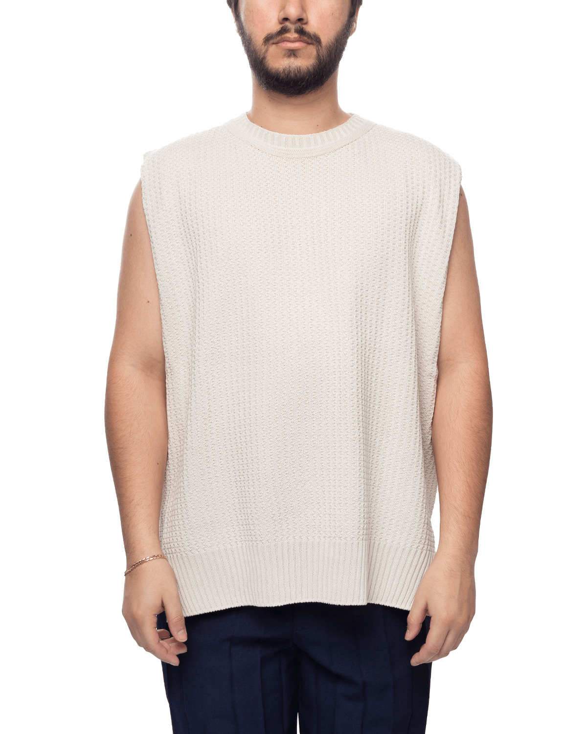 COMMON KNIT is crafted from soft cotton yarn, offering a lightweight feel perfect for spring and summer. They can be worn reversed to reveal the parallel lines of a pleated jersey for added dimension. This knit vest has a boxy fit and round neck. Material: 100% Cotton (Knit) Care: Machine wash cold, gentle cycle. Only non-chlorine bleach, when needed. Do not tumble dry. Flat dry in the shade. Do not iron. Do not dryclean.