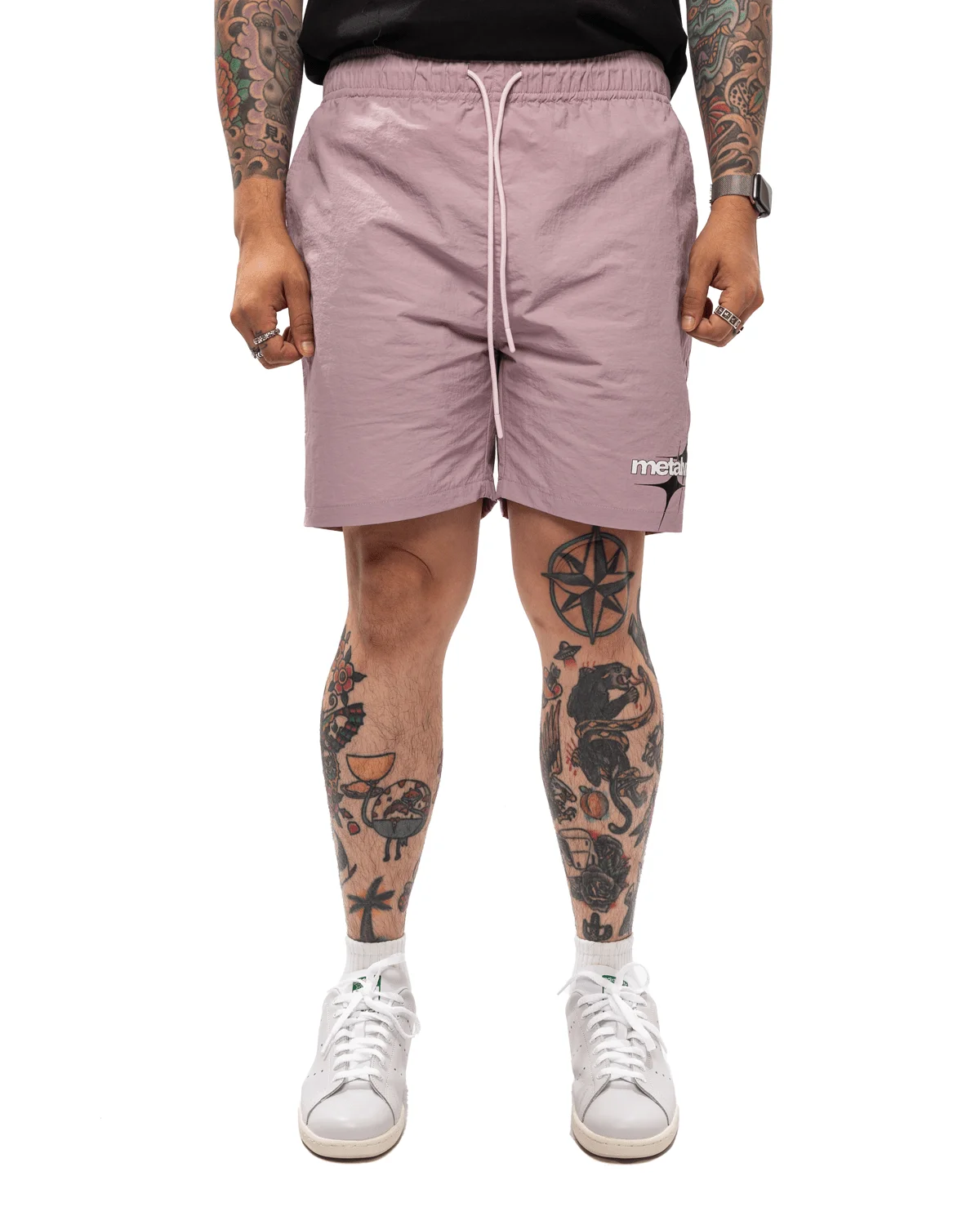 Metalwood Twinkle Water Trunk 'Pink' - Screen print detail at left thigh - 100% Nylon - MWS24-07-02-PNK Model is 5'9" wearing size 32.
