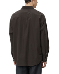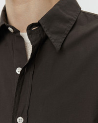 An oversized fit with drop shoulders and a rounded hem. Featuring a button placket, back yoke pleats and raw edged labels at end of both side seams in same fabric. Cut from a lightweight cotton with a smooth hand feel, in a brown micro structured tone on tone mini stripe. - Oversized fit - Garment washed - Made in Portugal - 100% cotton - Machine wash cold - Ivory resin buttons