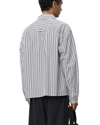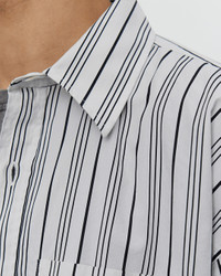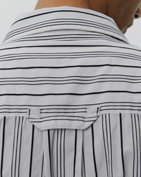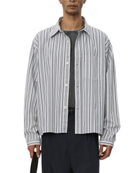 A relaxed, boxy silhouette with a slightly cropped cut, the Snooze Shirt from mfpen balances structure and ease. Designed with dropped shoulders, a straight hem, and raw-edged hanger loop detail at the back yoke. Crafted from textured cotton with a raised black-and-white stripe against a soft grey base—subtle contrast meets quiet precision. - Boxy fit - Ivory resin buttons - Made in Portugal - 100% cotton - Machine wash cold