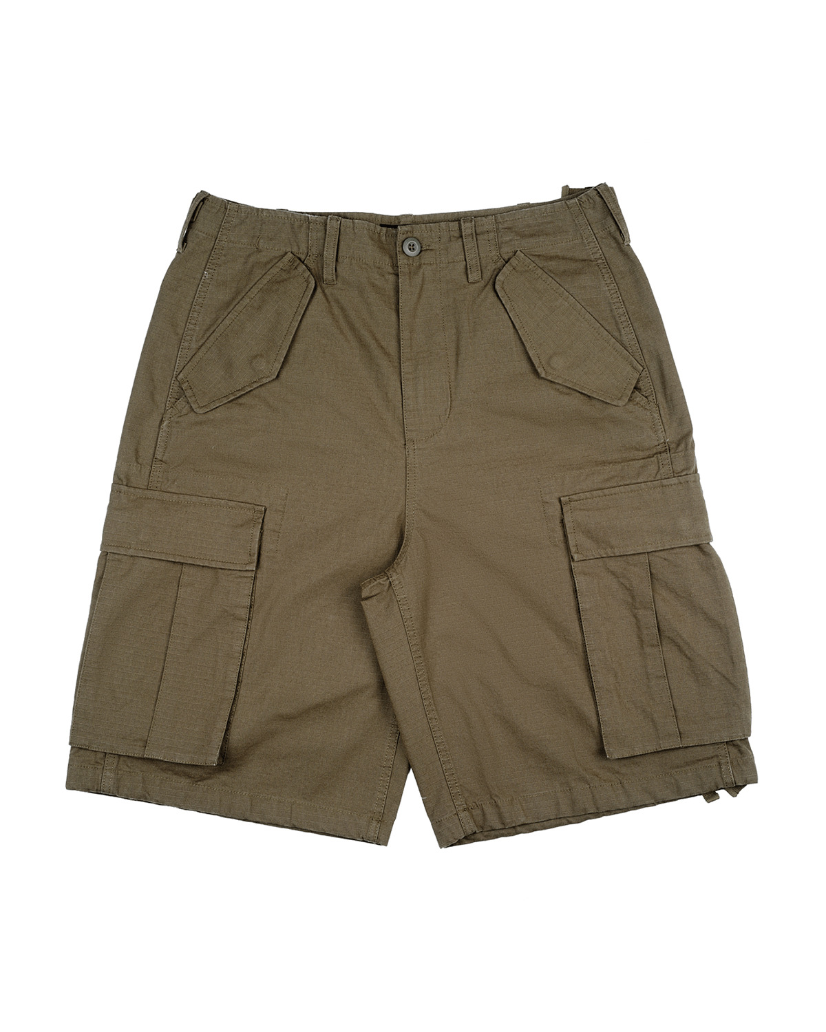 Baggy fit short in stonewashed cotton ripstop with cargo pocket detailing. Roomy fit with a relaxed rise. Stussy stock flag label at right rear pocket. Size down for a more true-to-size fit in the waist. - Button closure and zip fly - Adjustable waist tabs - Angled flap pockets - Rear flap pockets - Bellow pockets at thigh - Hidden snap closure at all pockets - Flat drawcords at hem - Roomy fit - Relaxed rise - Unisex - Size 32 inseam: 11 ½" / 29.2cm - Size 32 leg opening: 27" / 68.6cm - Material: 100% cotton - Imported