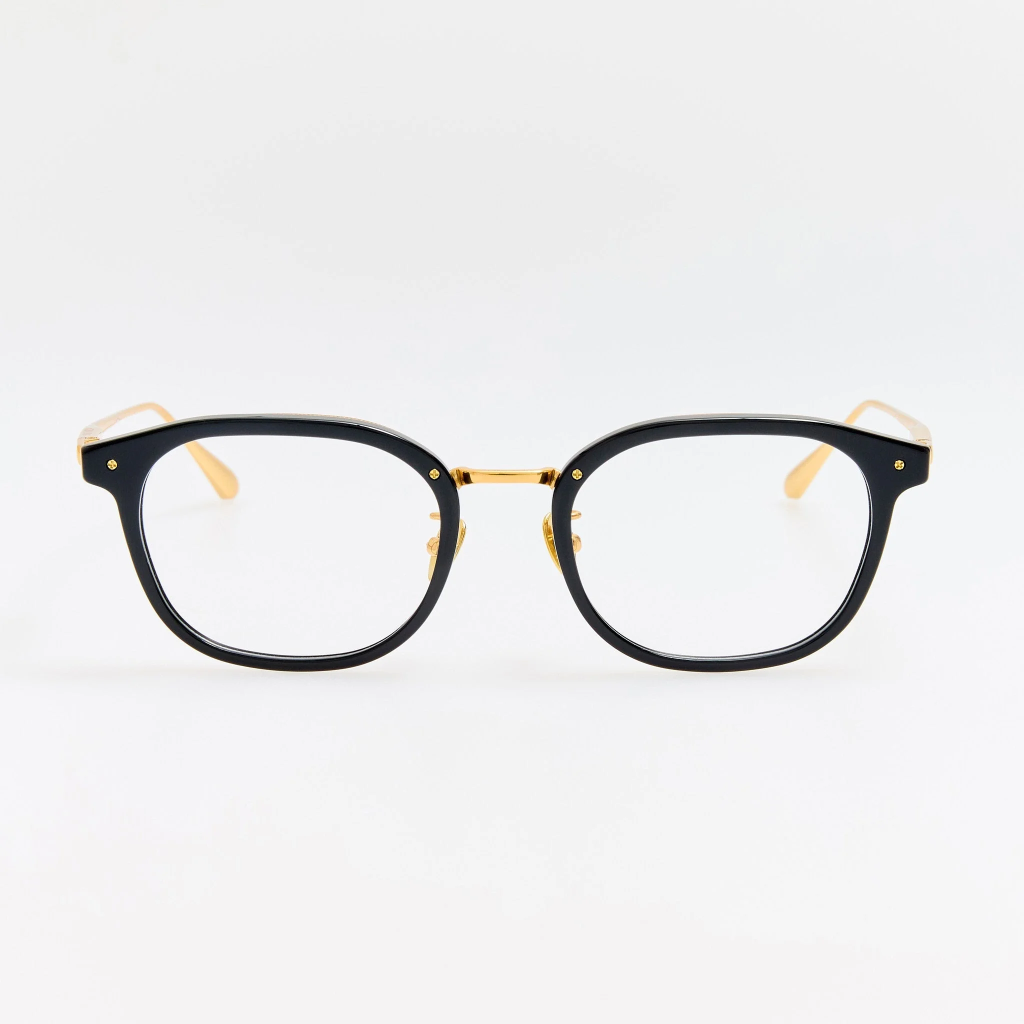 Finely sculpted black acetate rims are paired with a delicate 22 karat yellow gold plated titanium frame work which runs along the inner brown and into sleek tapered temples. This optical d-frame is fitted with adjustable titanium nose pads that offer a tailored fit by allowing bespoke positioning for enhanced comfort. Details -Optical lens free from prescription -Acetate frame with titanium temples -Titanium Made in Japan -sku:LFL1611C1OPT Size & Fit 50mm lens width 18mm bridge width 145mm temple length