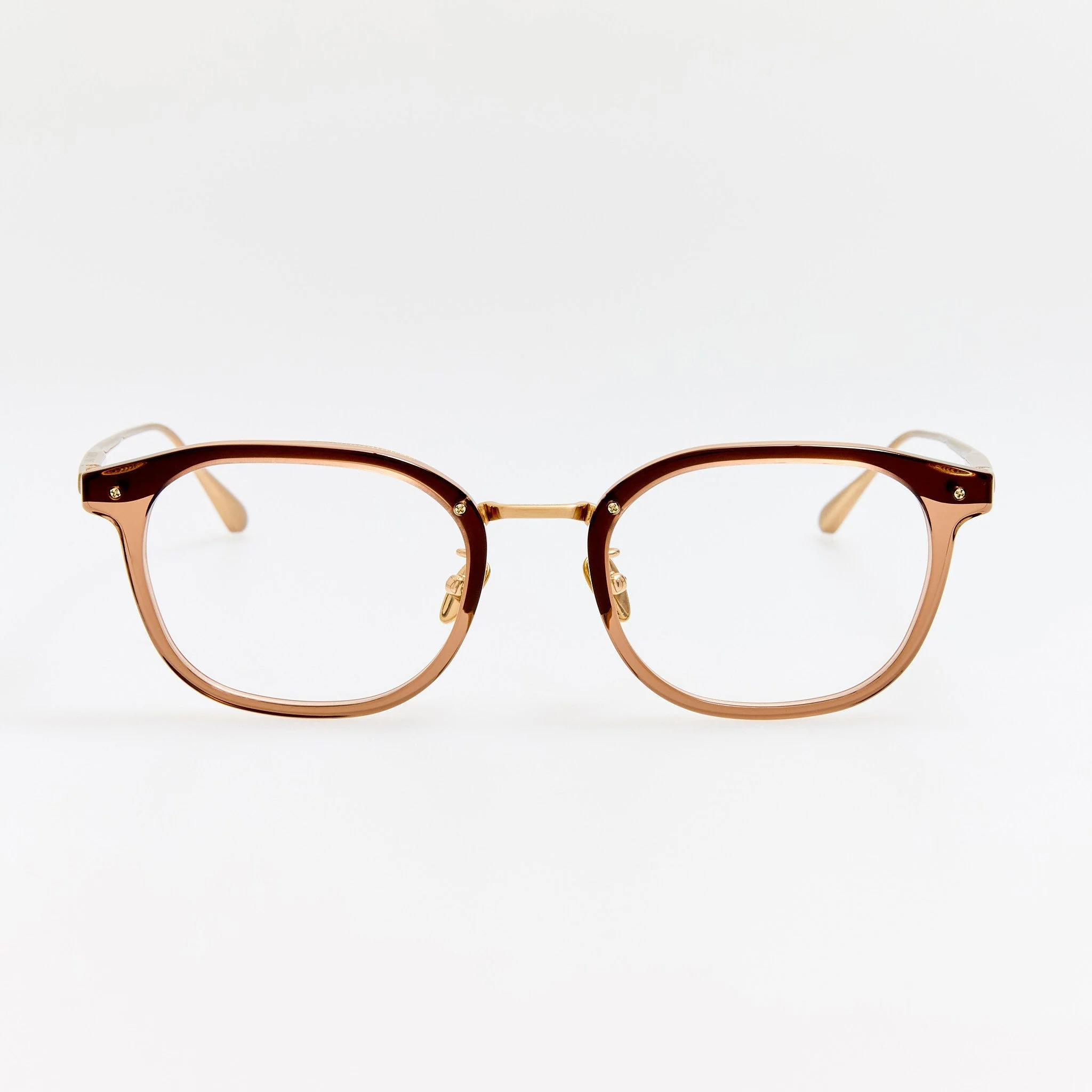 Finely sculpted brown acetate rims are paired with a delicate matt champagne plated titanium frame work which runs along the inner brown and into sleek tapered temples. This optical d-frame is fitted with adjustable titanium nose pads that offer a tailored fit by allowing bespoke positioning for enhanced comfort. Details -Optical lens free from prescription -Acetate frame with titanium temples -Titanium Made in Japan -sku:LFL1611C2OPT Size & Fit 50mm lens width 18mm bridge width 145mm temple length