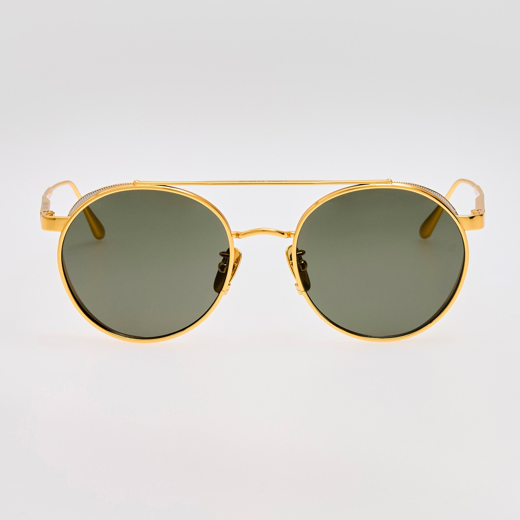 The Conor sunglasses boast a sleek oval frame made from 22 carat yellow gold plated pure Japanese titanium, combining durability with luxurious style.This model pairs perfectly with solid grey lenses that offer full UV protection. Adjustable nose pads ensure comfort and a secure fit for all-day wear. Details -Country of origin: Japan -100% UV protected lenses -Titanium frame with titanium temples -sku:LFL1549C1SUN Size & Fit 52mm lens width 19mm bridge width 145mm temple length