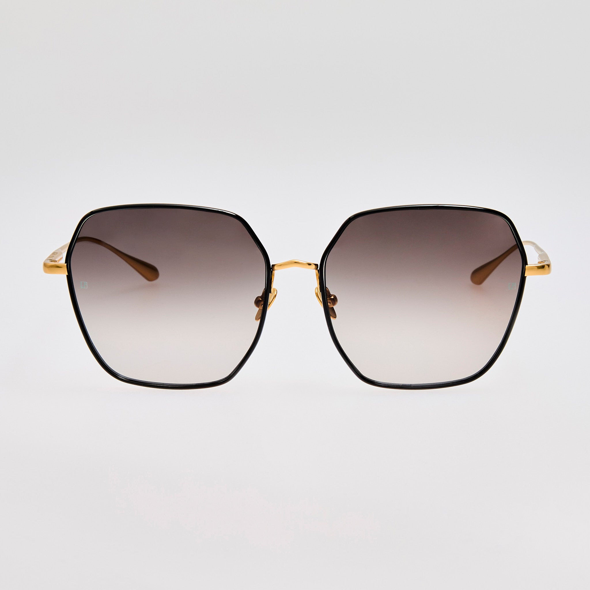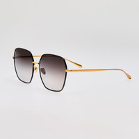 Introducing the DARCIE frame. These sunglasses feature an oversized silhouette crafted from ultra-lightweight Japanese titanium plated in 22 carat yellow gold. The black rim add bold contrast to the luminous gold structure. Finished with gradient grey lenses offering full UV protection, the frame features adjustable nose pads for a tailored fit. Details -Country of origin: Japan -100% UV protected lenses -Titanium frame with titanium temples -sku:LFL1576C1SUN Size & Fit 60mm lens width 16.5mm bridge width 145mm temple length