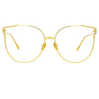 These oversized oval eyeglasses employ a signature LINDA FARROW design language. Fine layers of 22 carat yellow gold plated titanium are stepped together to create a delicate side shield which is complemented by a cut away corner detail exploring negative space. The frame is completed with tapered temples and adjustable nose pads for a tailored fit. Details -Optical lens free from prescription lenses -Titanium frame with titanium temples -Made in Japan -sku:LFL996C5OPT Size & Fit 59mm lens width 16mm bridge width 140mm temple length