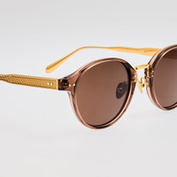 Discover refined elegance with the Marco sun model, featuring a combination frame of 22 carat yellow gold temples paired with brown Italian acetate. The oval frame shape houses green lenses that provide superior UV protection. Made with high-quality materials, this frame combines durability with a lightweight feel and includes laminated nose pads for optimal comfort. Details -Country of origin: Japan -100% UV protected lenses -Acetate frame with titanium temples -sku:LFL1535C10SUN Size & Fit 49mm lens width 21mm bridge width 145mm temple length