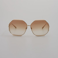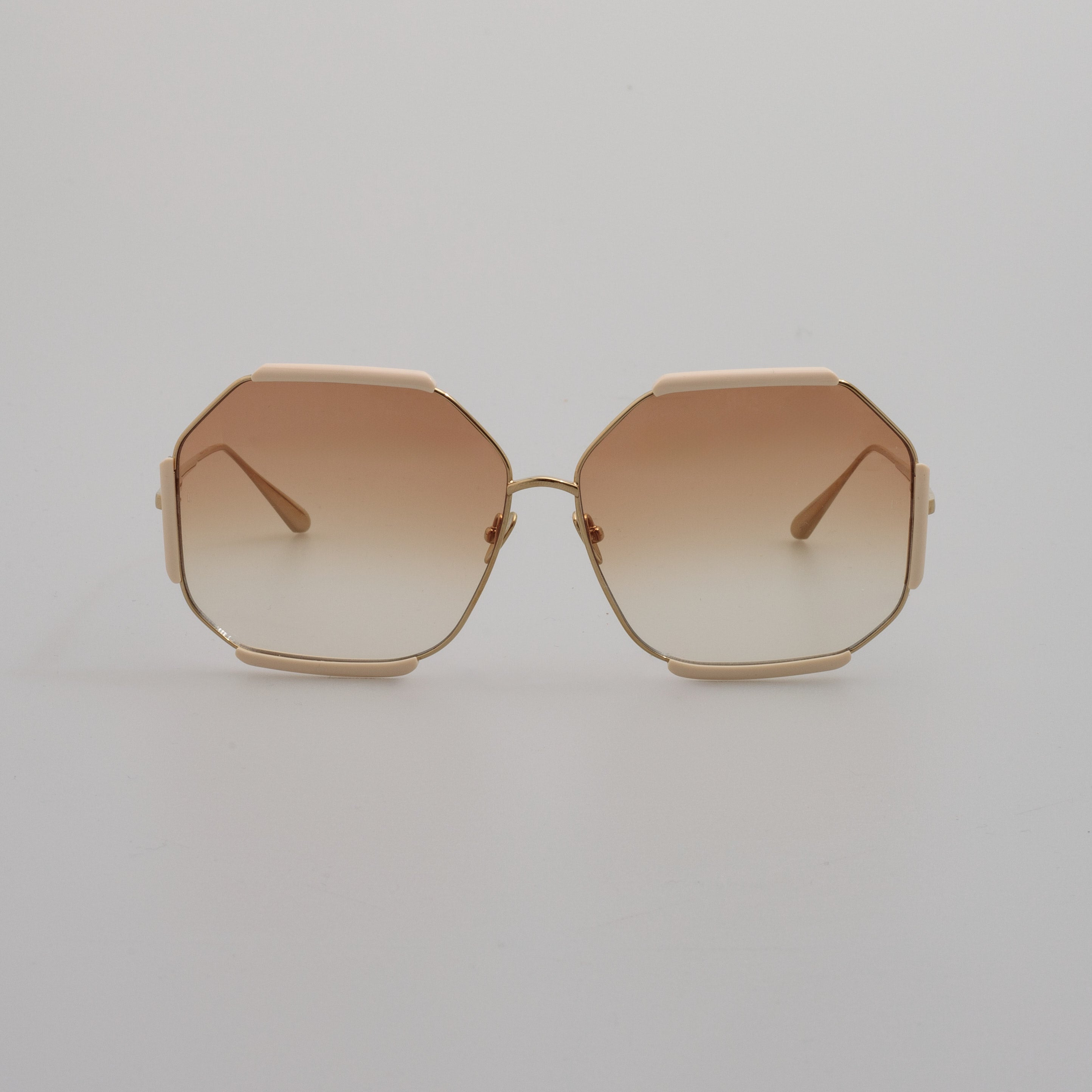 Reminiscent of 1970s playful allure these hexagon sunglasses channel a quintessential LINDA FARROW design language. A delicate 22 carat light gold plated titanium rim is accented with glossy tortoise shell acetate details. Paired with the Cream Square Link Acetate Chain Details -100% UV protected solid lenses -Acetate Frame with Titanium Temples -Made in Japan -sku:LFL1308C3SUN Size & Fit 66.5mm lens width 13mm bridge width 145mm temple length