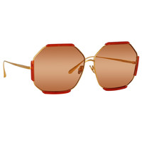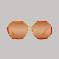 Reminiscent of 1970s playful allure these hexagon sunglasses channel a quintessential LINDA FARROW design language. A delicate 22 carat light gold plated titanium rim is accented with glossy terracotta acetate details.