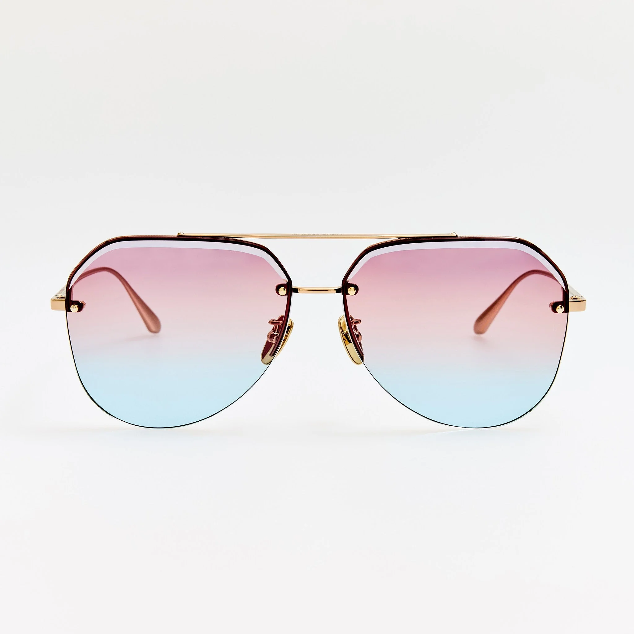 This product is a limited edition of 100. The edition number is printed on the inside of the temple #/100. The Quynh aviator frame is crafted from pure Japanese titanium in 22K light gold. Fitted with dusk gradient lenses offering full UV protection. The frame is fitted with adjustable titanium nose pads that offer a tailored fit by allowing bespoke positioning for enhanced comfort. Details -Country of origin: Japan -100% UV protected gradient lenses Titanium frame with titanium temples -Titanium Made in Japan -sku: LFL1557C6SUN Size & Fit 63mm lens width 13mm bridge width 145mm temple length