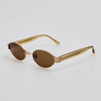 This oval-shaped combination frame is crafted from 22 karat light gold-plated pure Japanese titanium with contrasting Italian acetate khaki temples, offering a refined and contemporary look. These sunglasses provide solid khaki lenses with 100% UV protection for complete sun safety. The frame is fitted with adjustable titanium nose pads, allowing a bespoke fit tailored to your comfort. Details -Country of origin: Japan -100% UV protected lenses -Titanium frame with acetate temples -sku:LFL1469C5SUN Size & Fit 53mm lens width 20mm bridge width 145mm temple length
