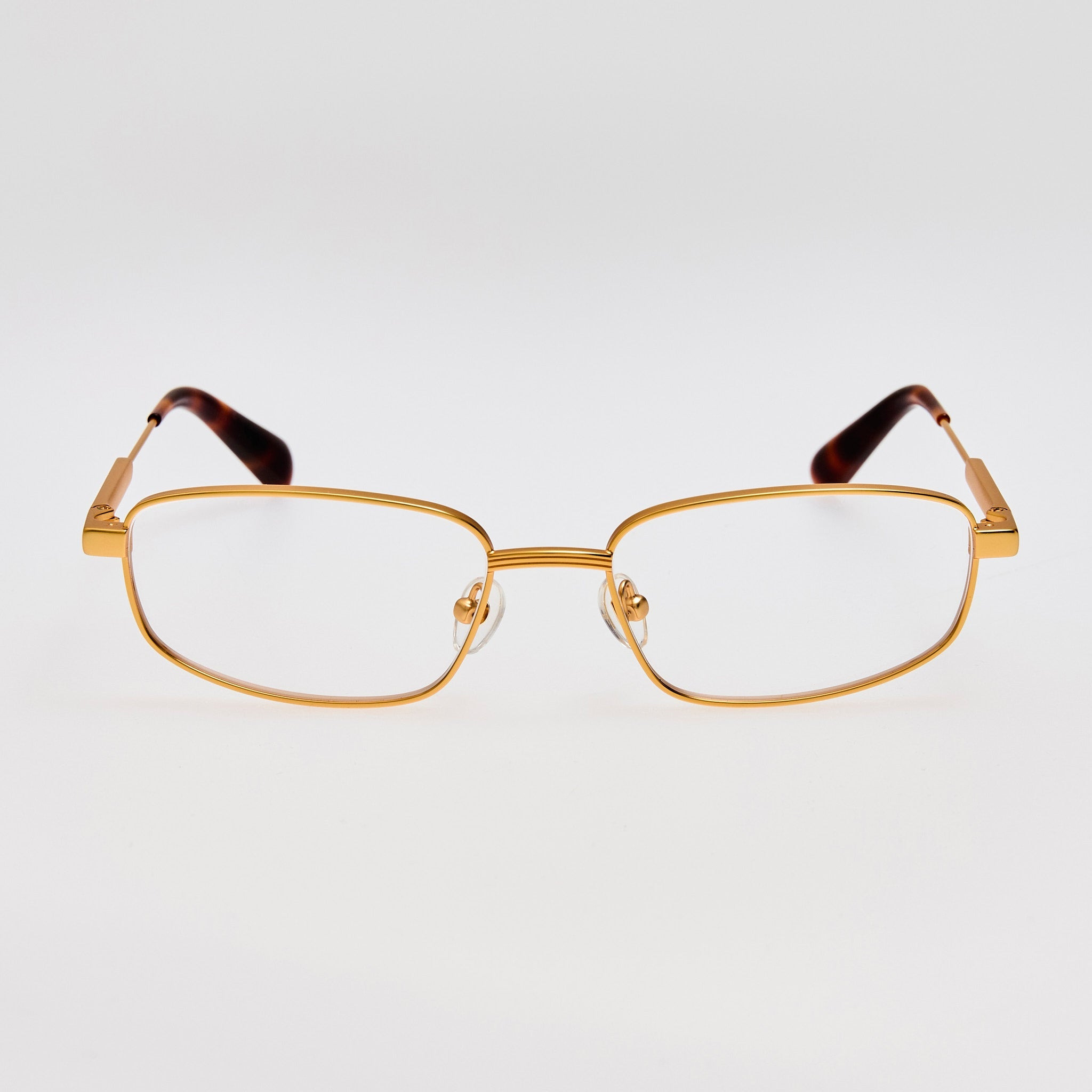 The SECRETAIRE sunglasses are crafted in matt gold stainless steel with tortoiseshell contrasting temple tips. Adjustable nose pads provide comfort, with gold-detailed temples completing the look. Details -Country of origin: Japan -Optical lens free from prescription -Stainless Steel Frame -sku:JAC116C3OPT Size & Fit 63mm lens width 12mm bridge width 135mm temple length