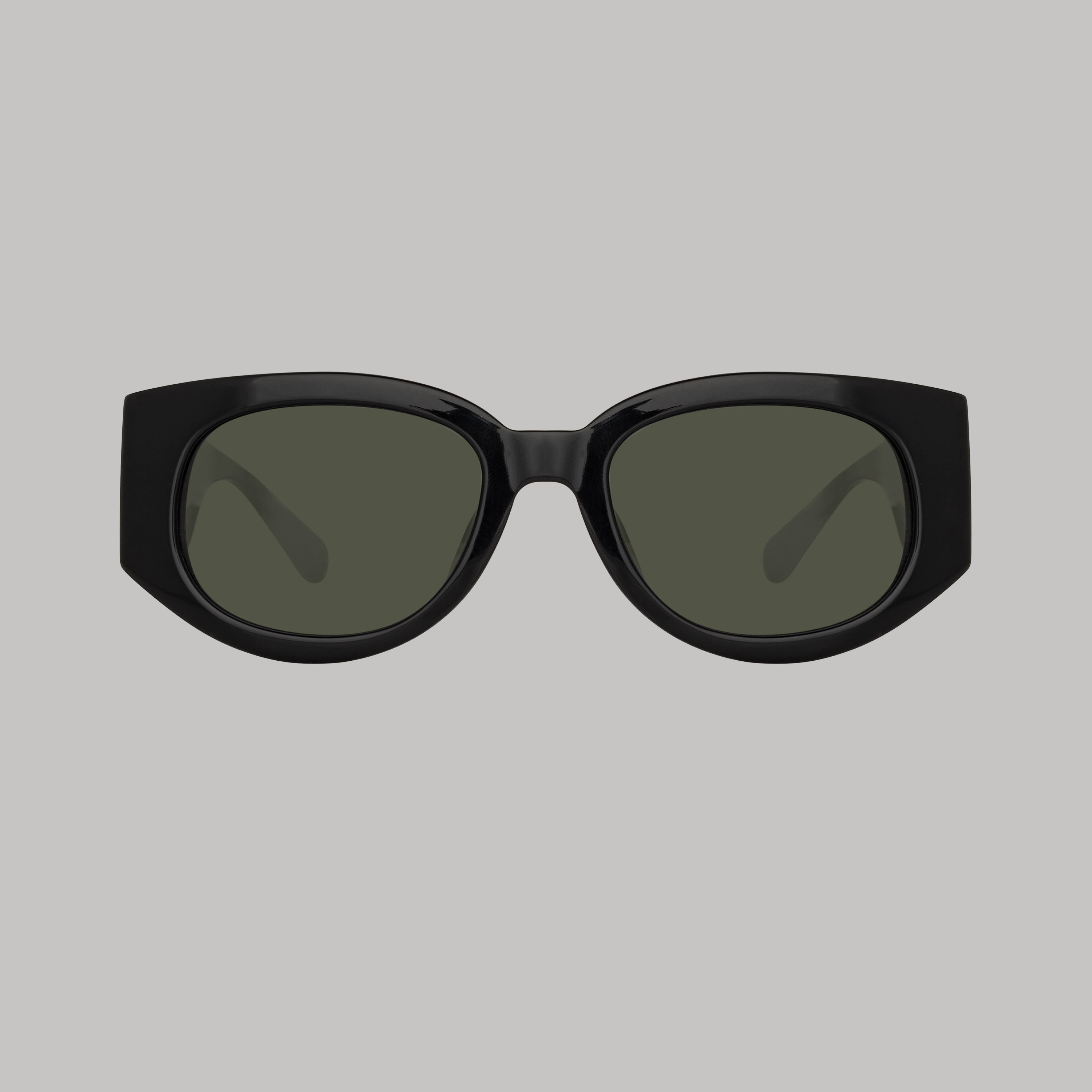 Formed from recycled black acetate these sculpted sunglasses from the LINDA FARROW collection are hand polished for a glossy finish. The rounded D-frame style features a gold-plated titanium eyelet set into the temple monogrammed with 'London 1970' to mark the founding of the brand. Details -100% UV protected soild lenses -Acetate frame with Acetate temples -Made in Japan -sku:LFL1059C1SUN Size & Fit 54mm lens width 19.5mm bridge width 145mm temple length