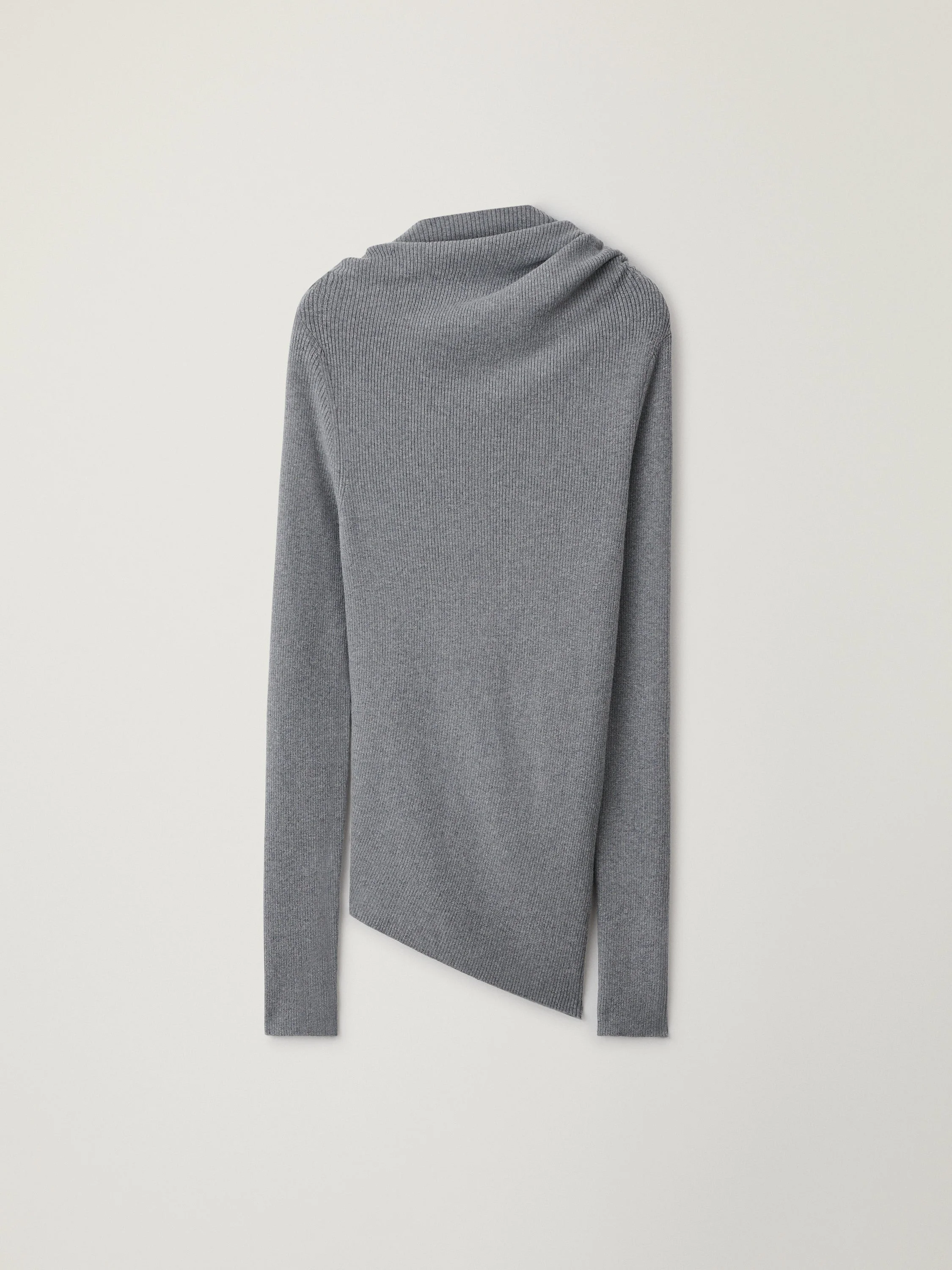 A dynamic silhouette, the Agie sweater takes our rib-knitted cotton cashmere composition from day to evening. The form-fitting, tubular frame has intricate drapes along the front and features an asymmetric neck and hemline and extended sleeves. DETAILS Knit type: Cotton Cashmere Gauge: 16 Weight: 325g Composition: 70% cotton, 30% cashmere SIZE GUIDE * European sizing * Designed for a regular fit * The model is 180 cm/5’11” tall and wears a size 1 Our sizes: Size 0: XS Size 1: S-M Size 2: M-L