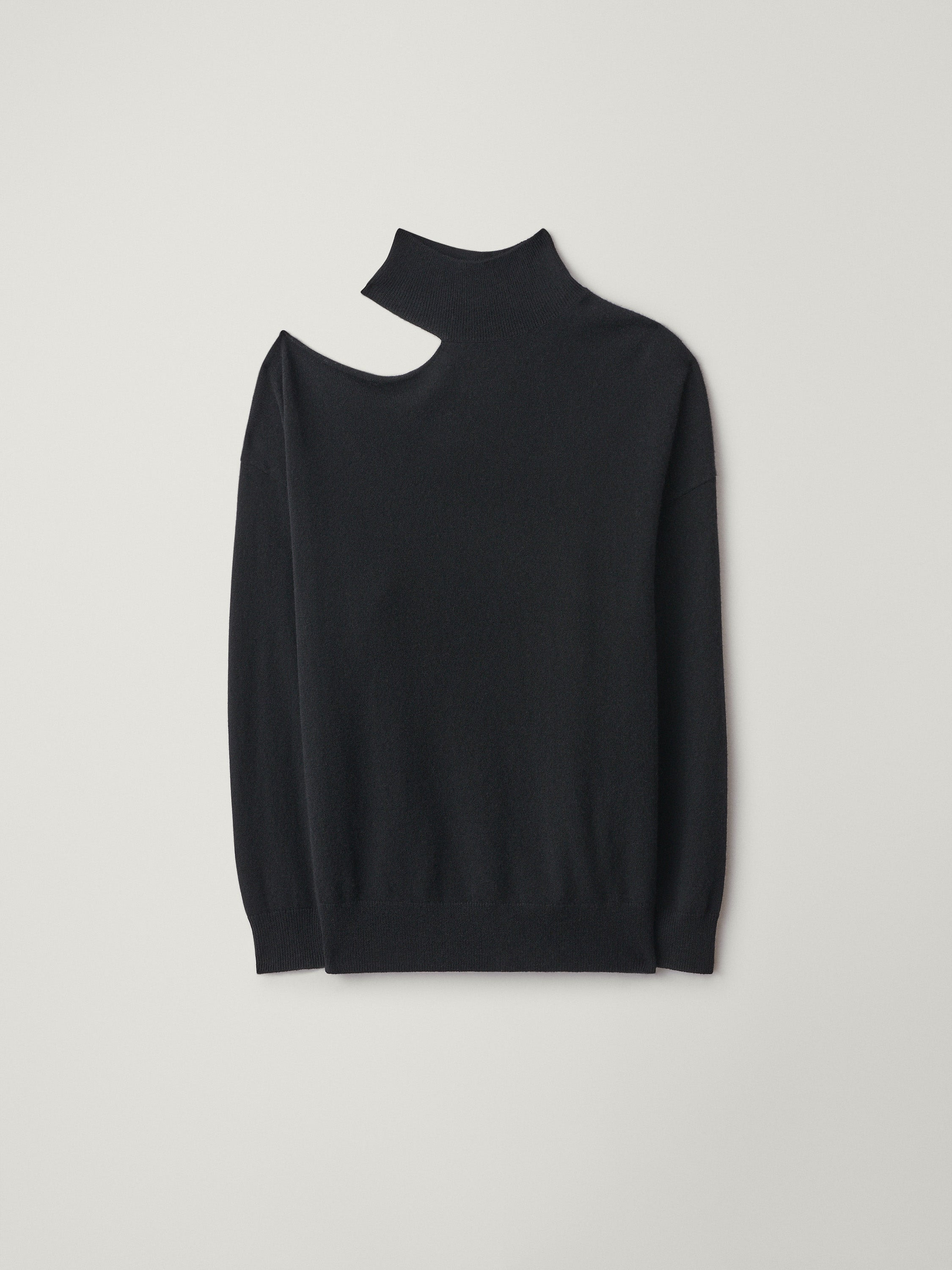 A novel construction, the Alvia sweater is crafted in mid-weight cashmere for transeasonal wear. The relaxed fit, hip-length silhouette features a high neck and ribbed trims throughout. A cut-out detail at the shoulder creates an asymmetrical look and unveils a subtle flash of skin. DETAILS Knit type: Plain Knit Gauge: 12 Weight: 250g Composition: 100% cashmere SIZE GUIDE * European sizing * Designed for a relaxed fit * The model is 180 cm/5’11” tall and wears a size 1 Our sizes: Size 0: XS Size 1: S-M Size 2: M-L