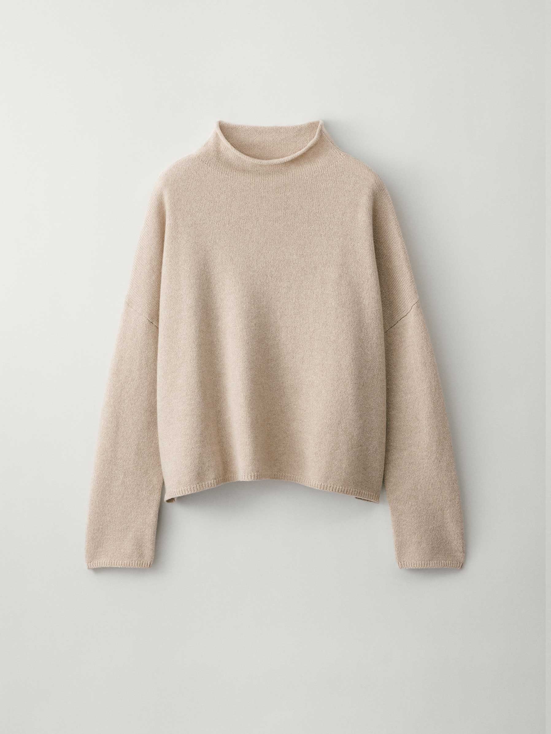 A plush top layer, the Sandy sweater is crafted in rich, heavy knit cashmere to wide proportions. The enveloping silhouette creates effortless drapes at the front and back, made sublime by the generous rolled mock neck and relaxed dropped shoulders. DETAILS Knit type: Plain Knit Gauge: 7 Weight: 280g Composition: 100% organic cashmere SIZE GUIDE * European sizing * Designed for a regular fit * The model is 178 cm/5’10” tall and wears a size 1 Our sizes: Size 0: XS Size 1: S-M Size 2: M-L Sandy's measurements: Size 0: * Body length: 51 cm * Chest: 66 cm Size 1: * Body length: 53 cm * Chest: 68 cm Size 2: * Body length: 55 cm * Chest: 71 cm