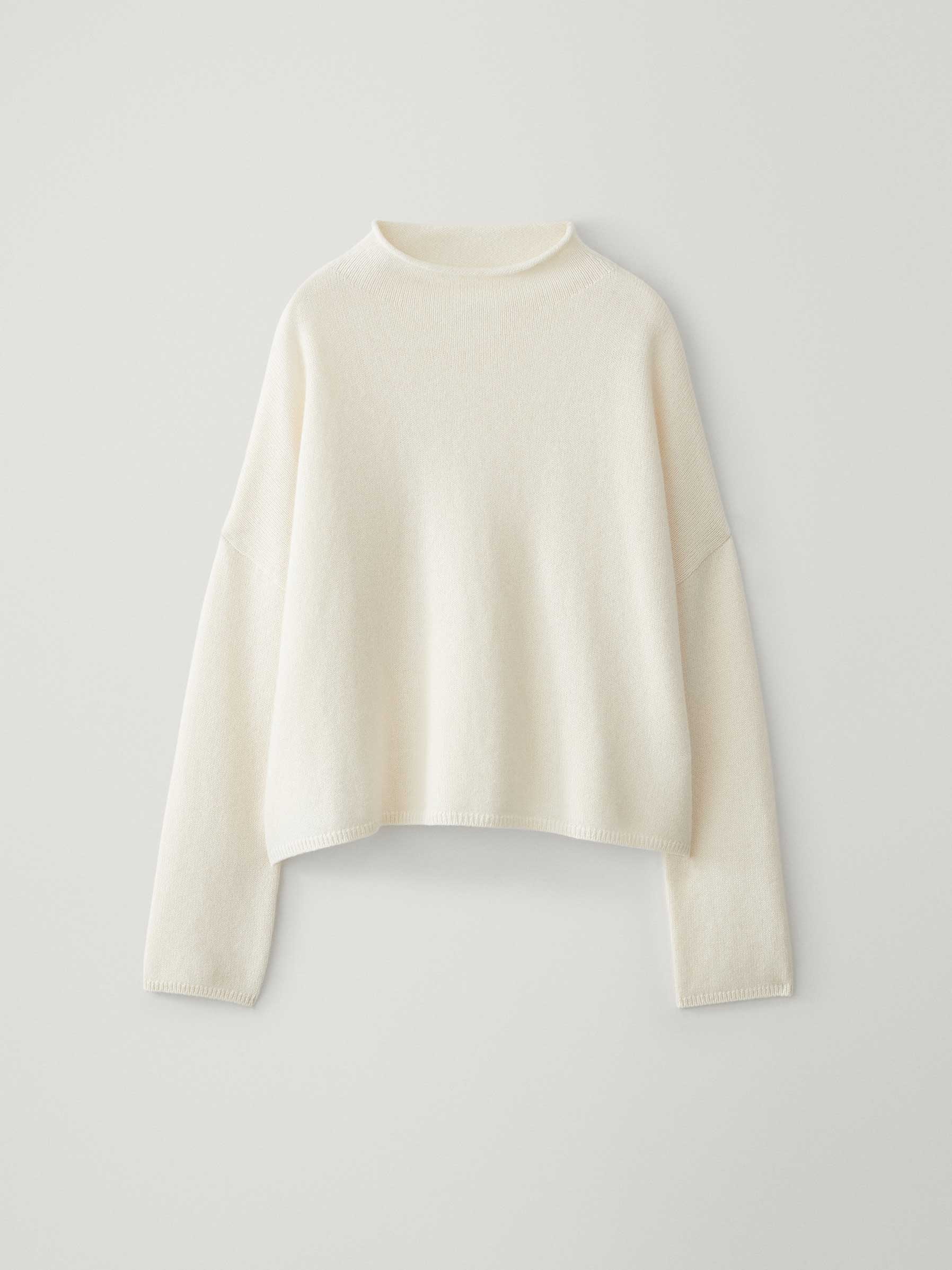 A plush top layer, the Sandy sweater is crafted in rich, heavy knit cashmere to wide proportions. The enveloping silhouette creates effortless drapes at the front and back, made sublime by the generous rolled mock neck and relaxed dropped shoulders. DETAILS Knit type: Plain Knit Gauge: 7 Weight: 280g Composition: 100% organic cashmere SIZE GUIDE * European sizing * Designed for a regular fit * The model is 178 cm/5'10" tall and wears a size 1 Our sizes: Size 0: XS Size 1: S-M Size 2: M-L Sandy's measurements: Size 0: * Body length: 51 cm * Chest: 66 cm Size 1: * Body length: 53 cm * Chest: 68 cm Size 2: * Body length: 55 cm * Chest: 71 cm