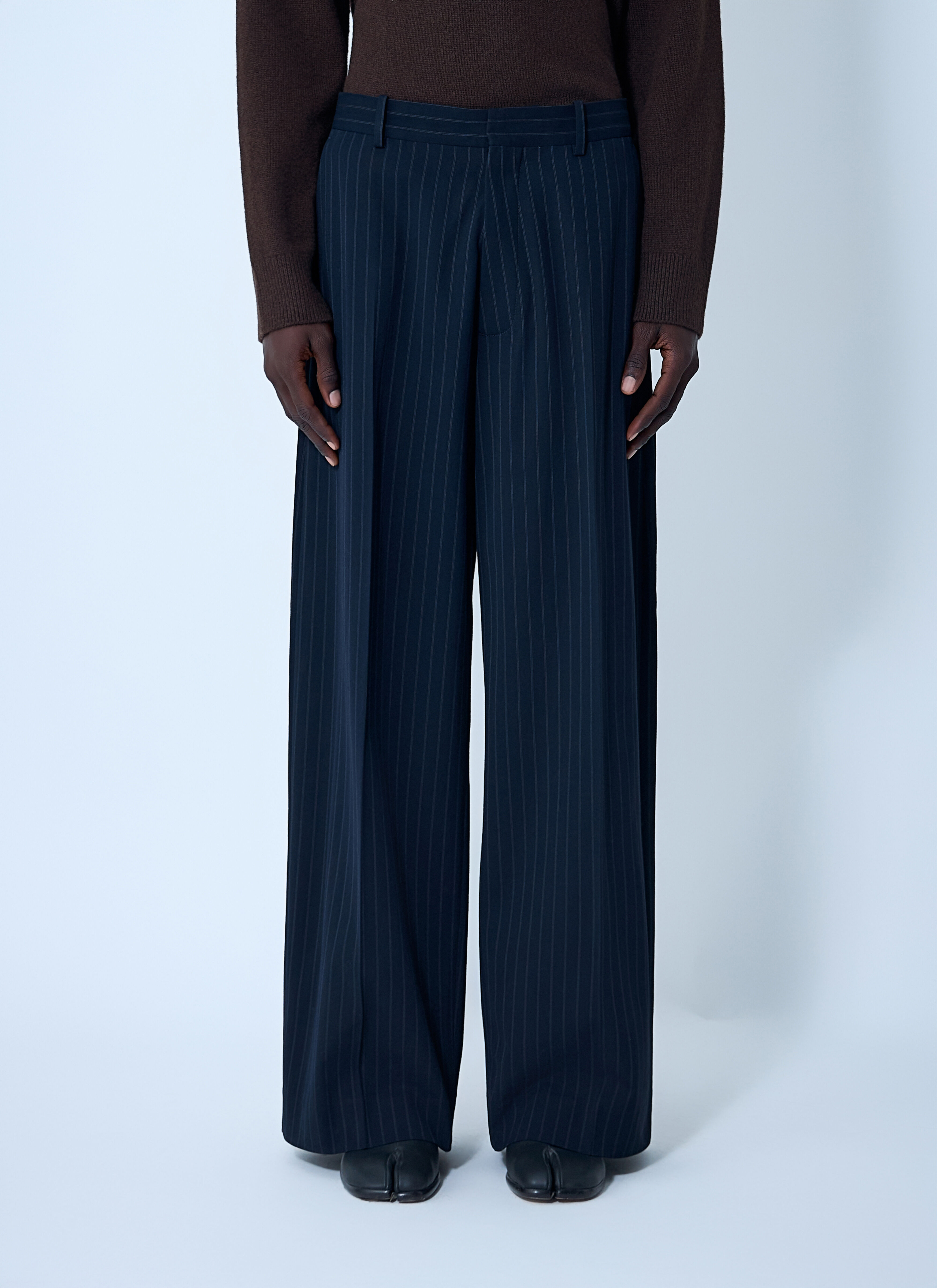 Mid-rise tailored pants in pinstripe. - Mid rise - Hook-and-eye and zip-fly fastening - Belt loops - Front pleats - Rear jet pockets - 97% Viscose, 2% Elastane, 1% Polyester. Dry clean - Color: Navy - Code: BK0701-BG3