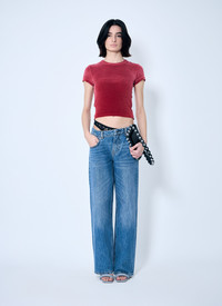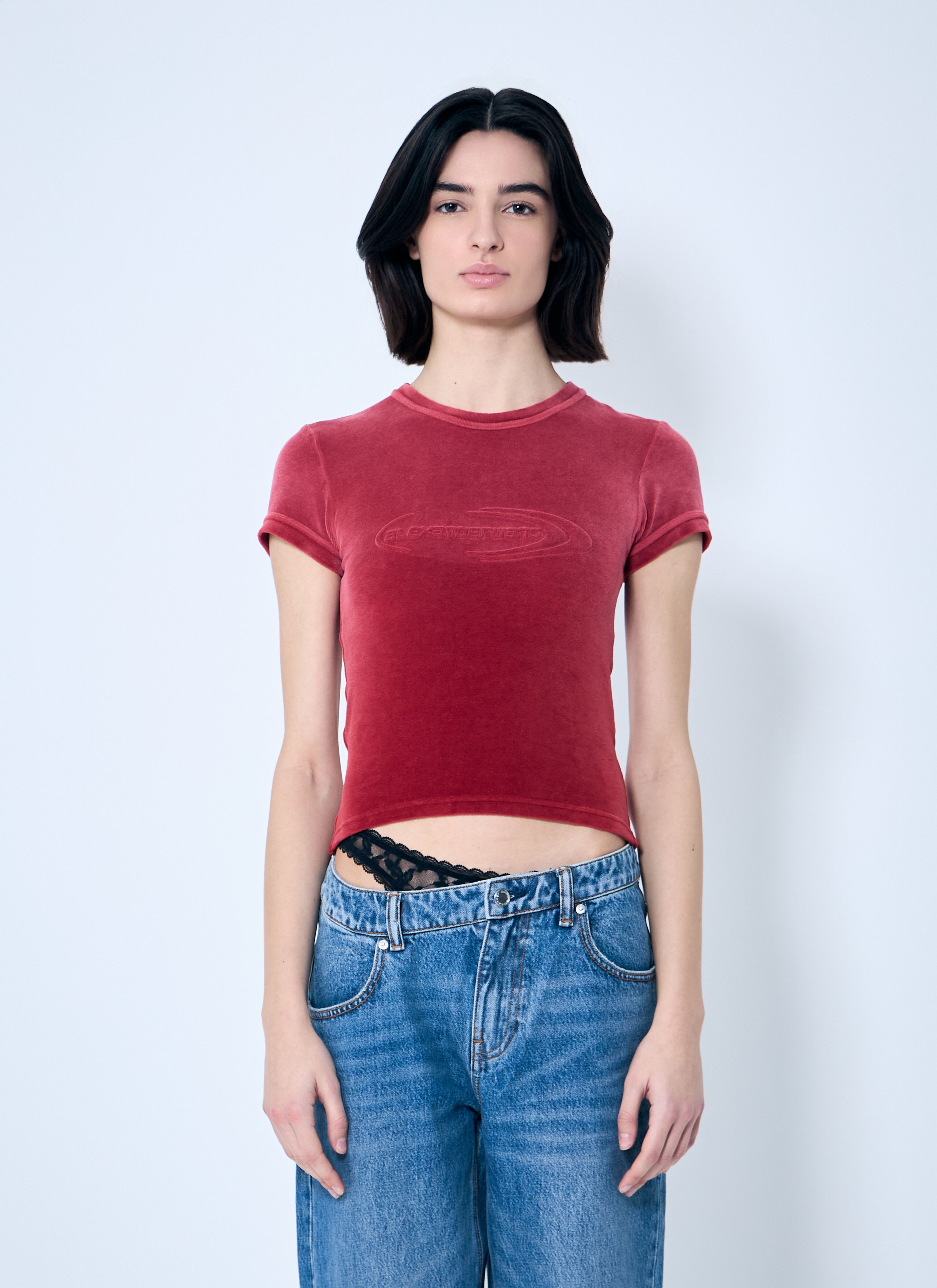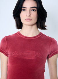Logo motif T-shirt in velvet. - Crewneck - Short sleeves - Front logo motif - 100% Cotton. Hand wash - Color: Red - Code: 4CC1251563-622A