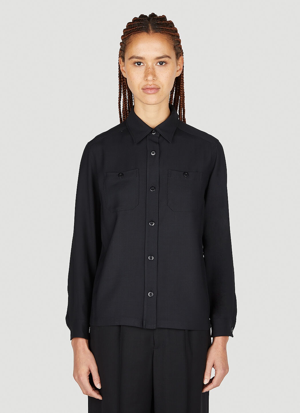 - Technical blend fabrication in a close weave - Classic collar - Front button fastening - Long sleeves - Buttoned cuffs - Chest patch pockets - 60% Viscose, 40% Wool. Dry clean - Color: Black - Code: VIAJK-F02710 LZZ