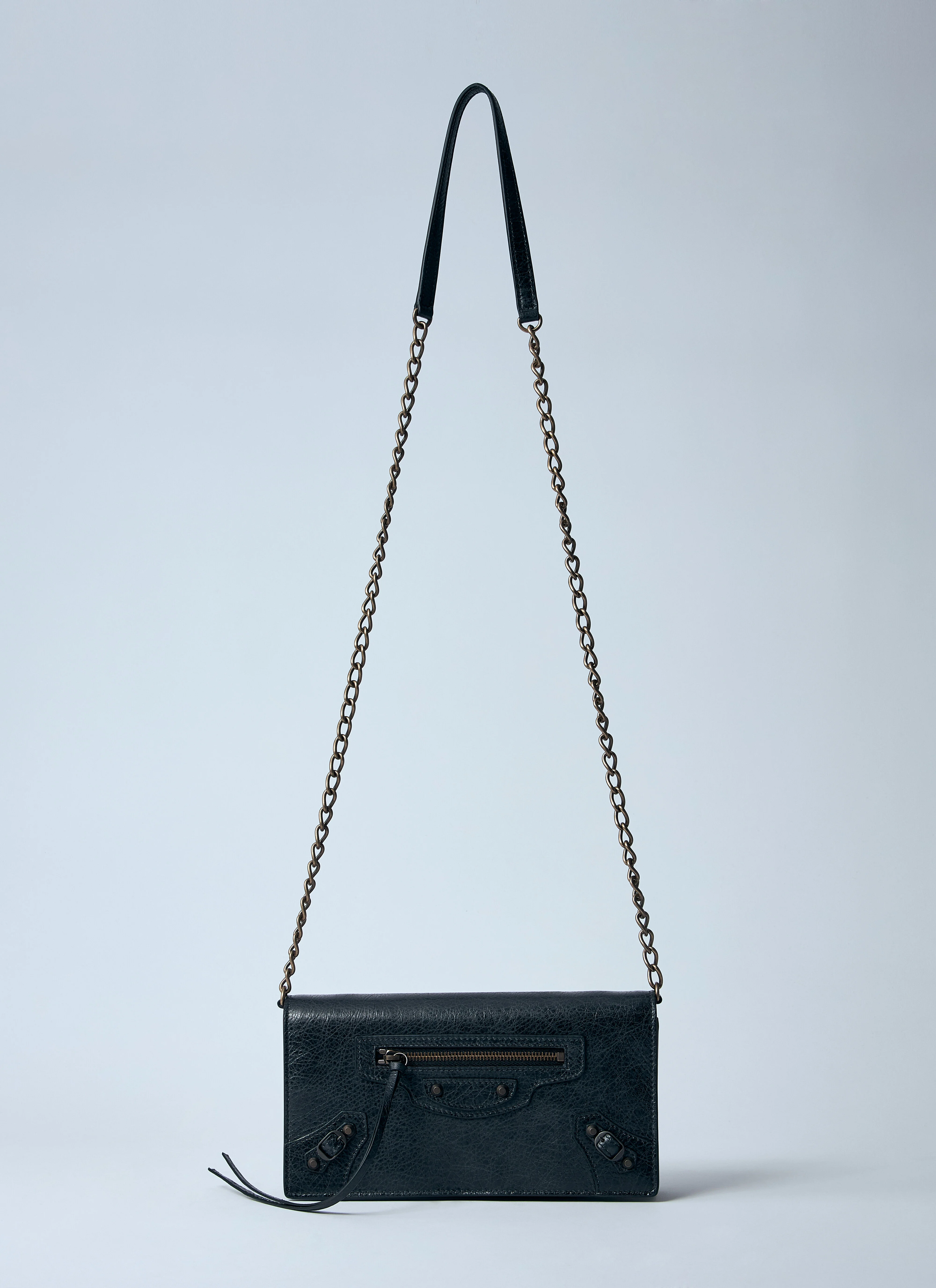 Le City chain wallet in leather with signature hardware. - Chain shoulder strap - Magnetic press-stud fastening with flap closure - Six interior card slots - Made in Italy - 100% Leather - Color: Black - Code: 819472 2ABEK 1000