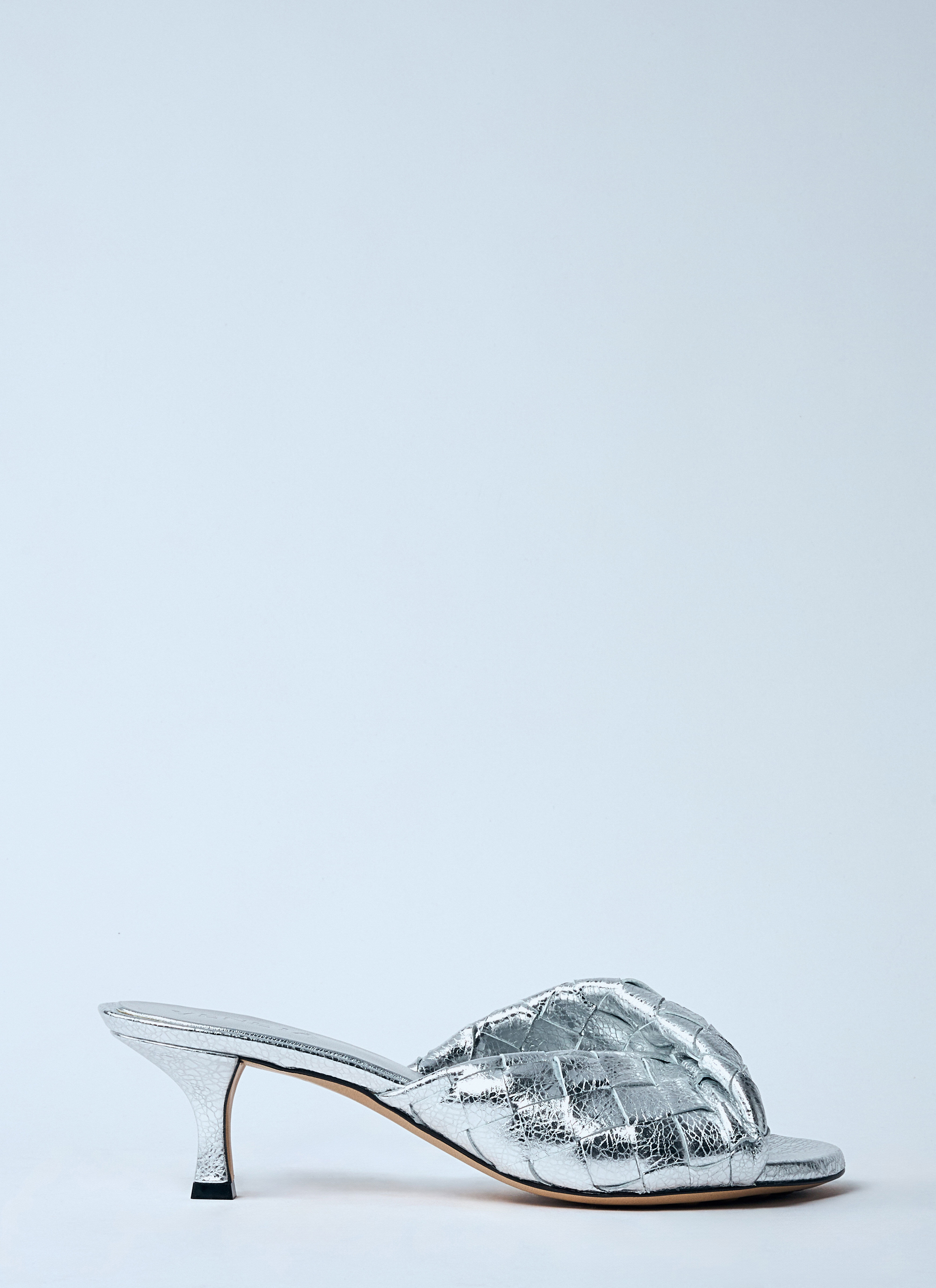 Blink heeled mules in intrecciato woven leather with metallic finish. - Open toe - Knotted strap - Stiletto heel - Made in Italy - 100% Leather - Color: Silver - Code: 796464 V55N1 1156