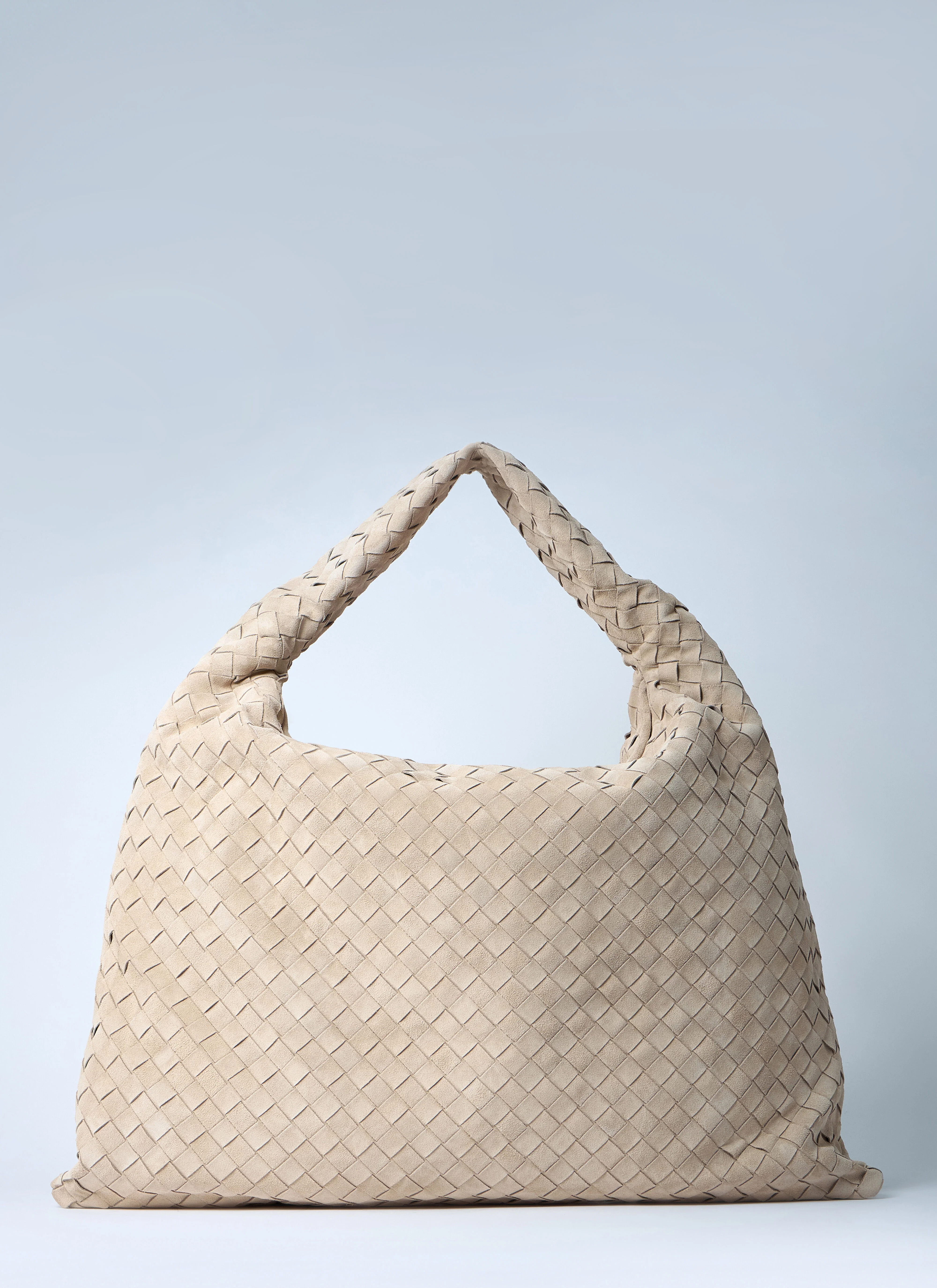 Large Hop shoulder bag in Intrecciato in smooth suede. - Top handle - Interior magnetic fastening - Intrecciato weave - One main compartment - Interior zip pocket - Made in Italy - 100% Leather - Color: Beige - Code: 763970 V1QE3 9614
