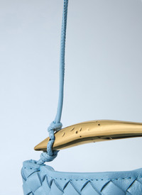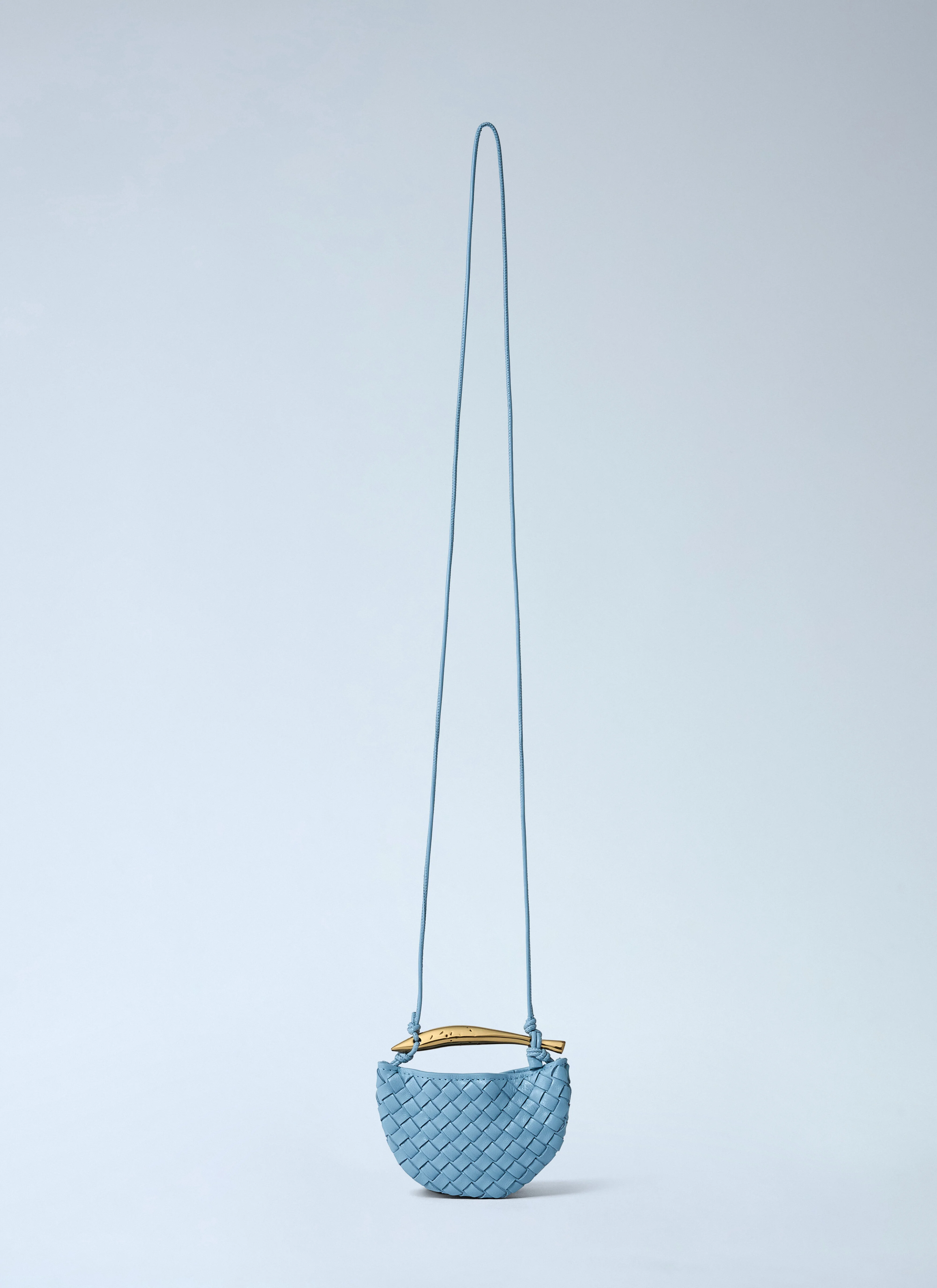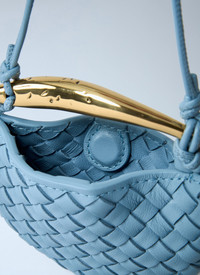 Miniature Sardine crossbody bag in intrecciato woven leather with rovere oak handle. - Crossbody strap - Top handle - Intrecciato weave - One main compartment - Made in Italy - 100% Leather - Color: Light Blue - Code: 836834 V5QE0 1728