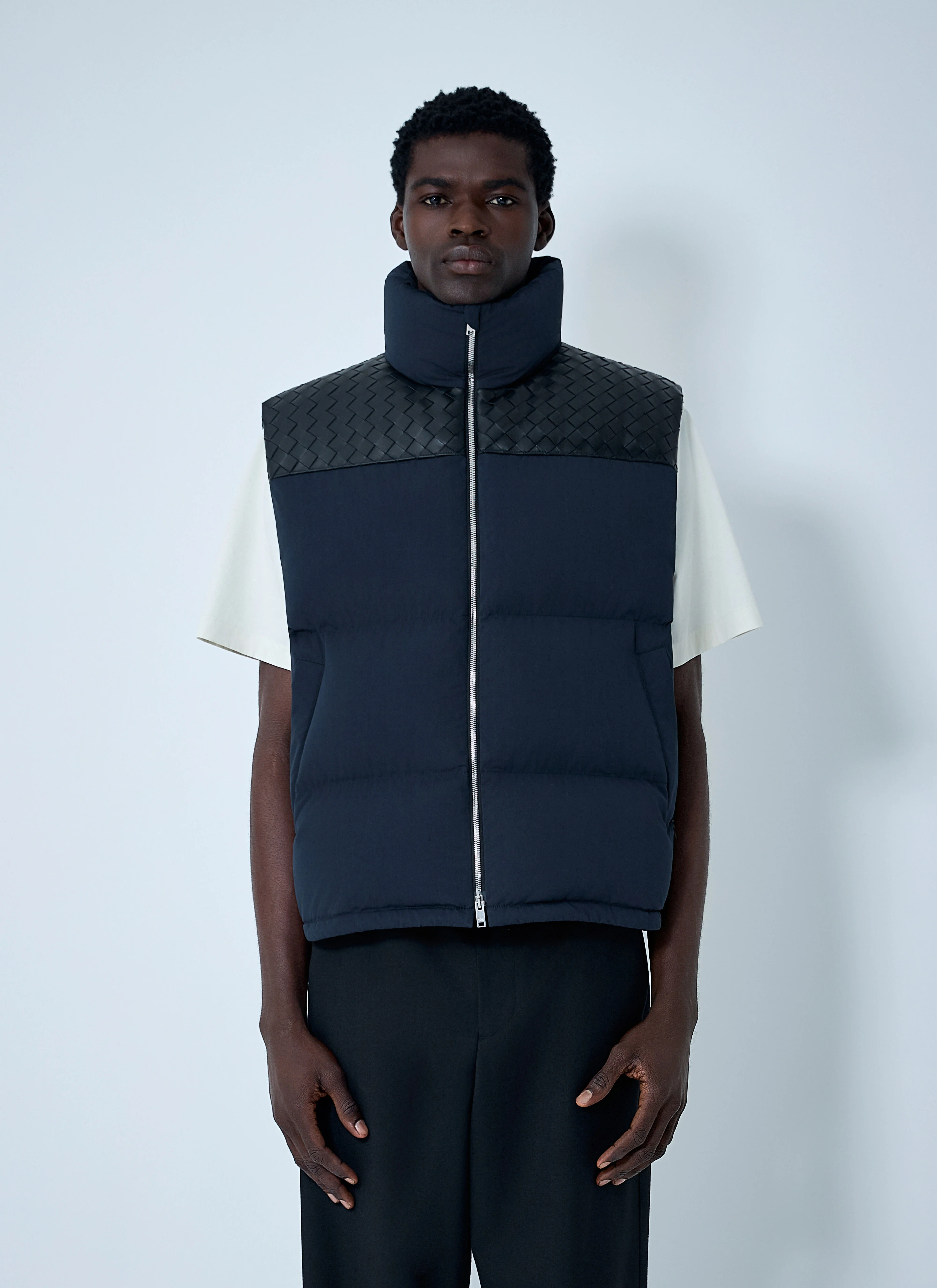 Puffer gilet realised in lightweight matte technical cotton with Intrecciato leather detail. - Stand collar - Front zip fastening - Side slip pocket - 79% Cotton, 21% Polyamide. Dry clean - Color: Navy - Code: 837050 V5O60 4246