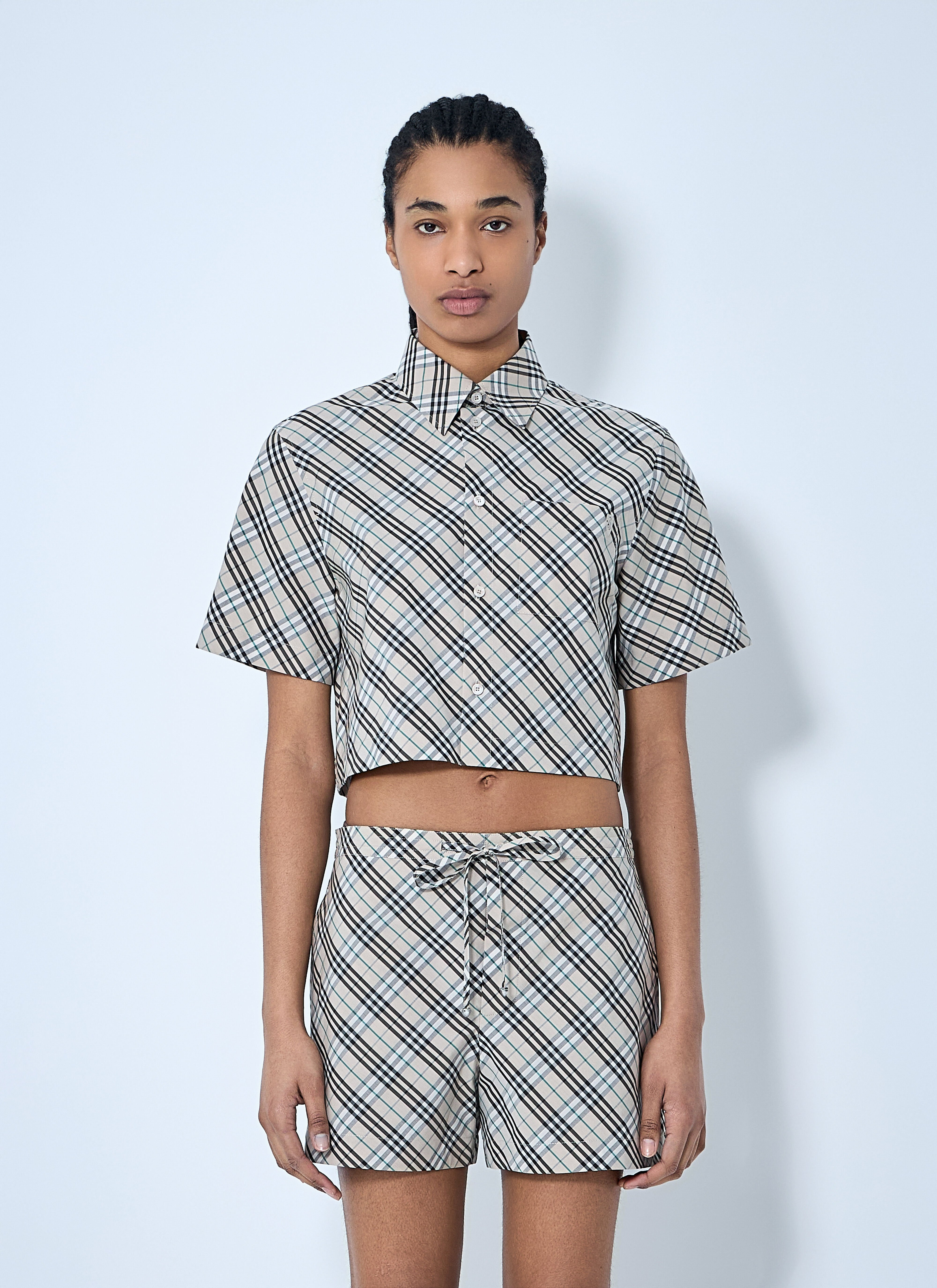 Crop shirt in signature check motif. - Classic collar - Front button fastening - Short sleeves - Chest patch pocket - 100% Cotton. Hand wash - Color: Beige - Code: 8101121 C1849