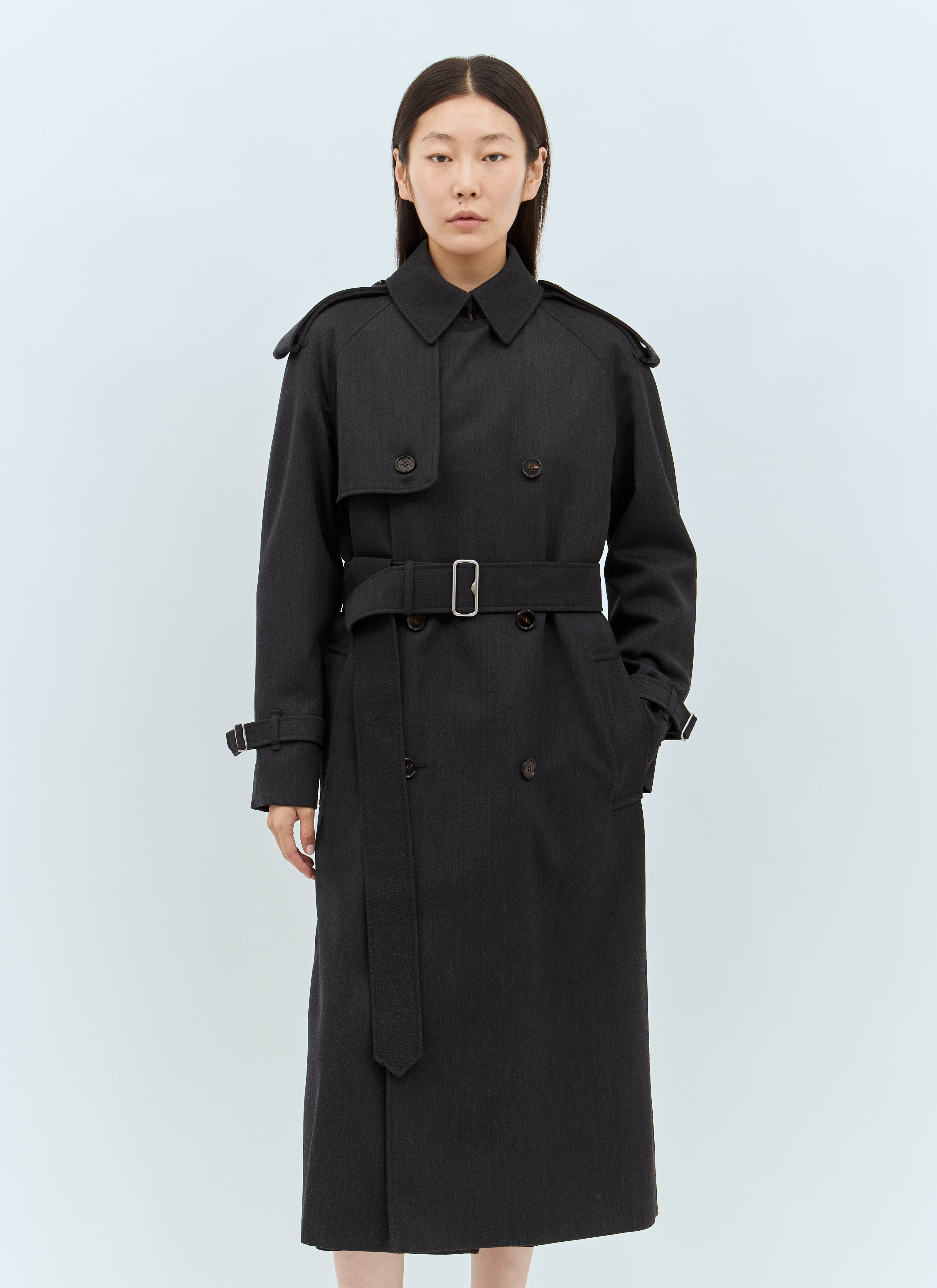 Long trench coat in wool twill. - Spread collar - Double-breasted button fastening - Long sleeves - Belted cuffs - Detachable buckle-fastening belt - Side slip pockets - Fully lined - Made in Italy - 100% Wool. Dry clean - Color: Grey - Code: 8095644 A1216